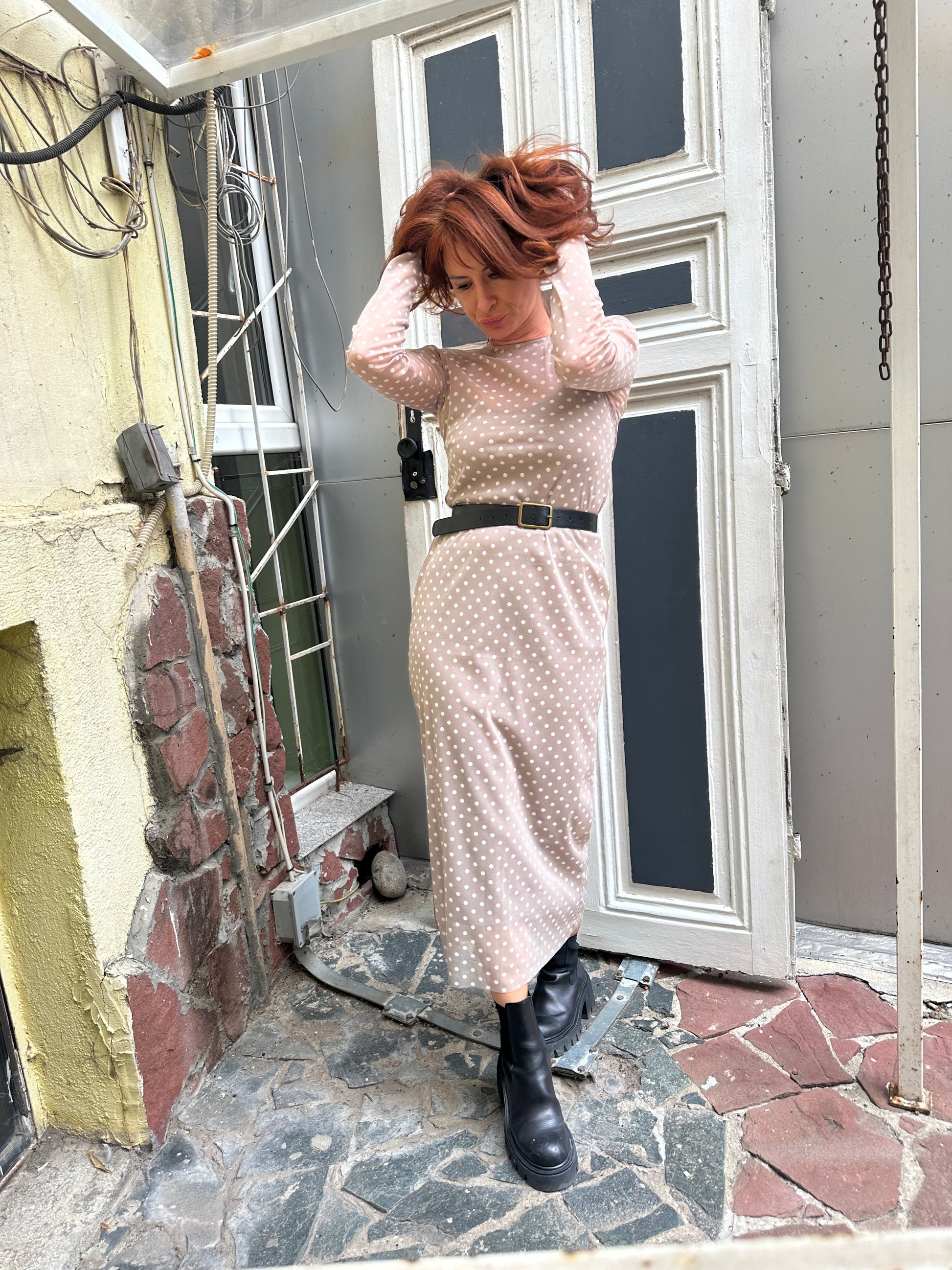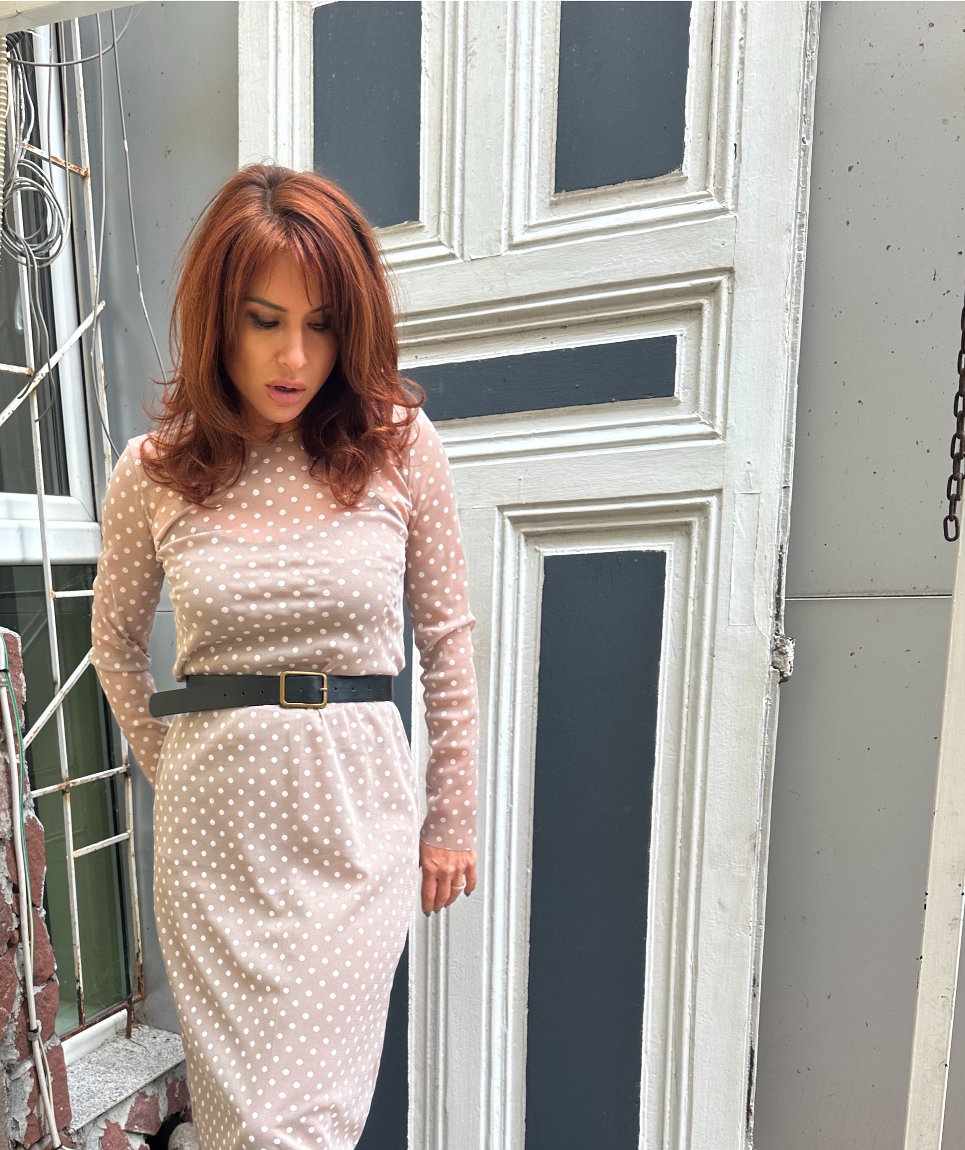Цветът - топъл нюд  излъчва деликатност и спокойствие, а черният колан акцентира върху талията, превръщайки минимализма в изявление.
