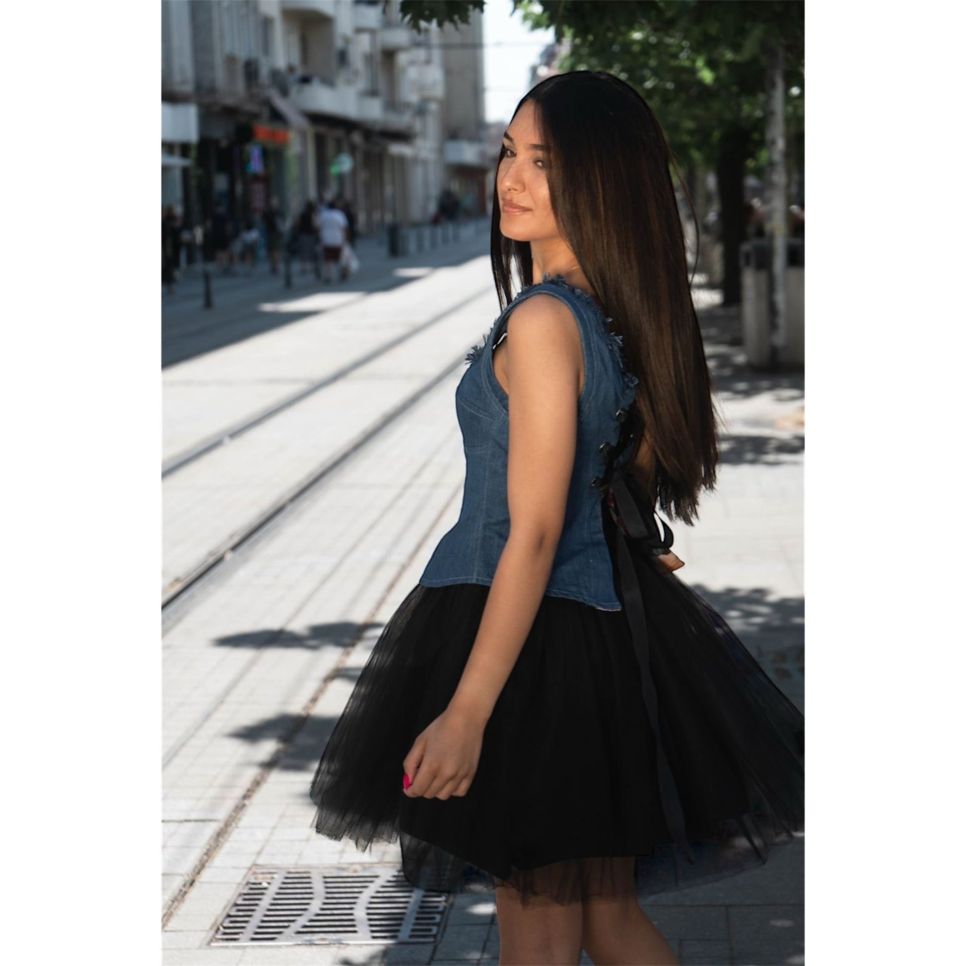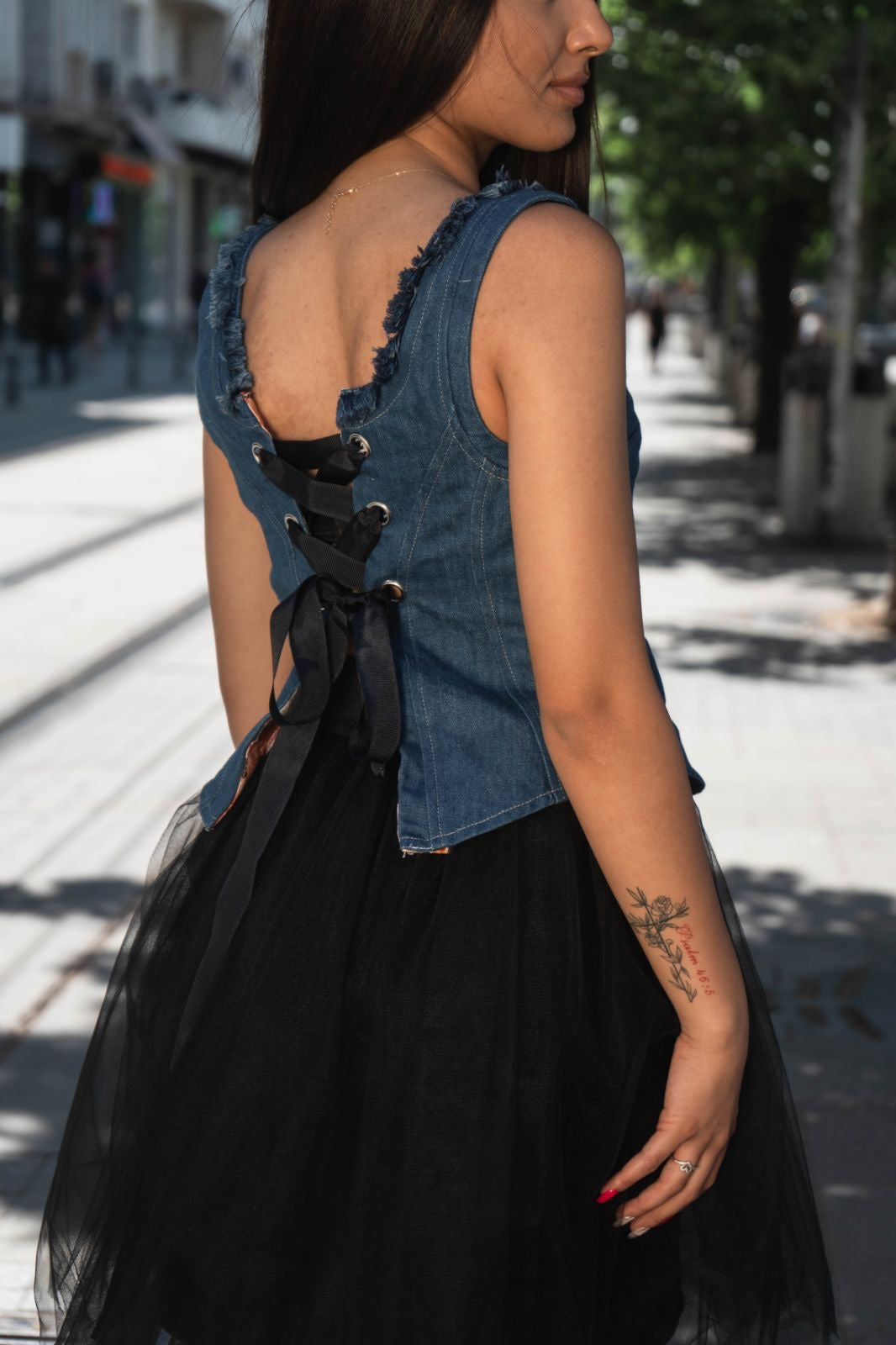 Корсетния силует се комбинира с удобството на класически елек, за визия, която балансира женственост и структура.