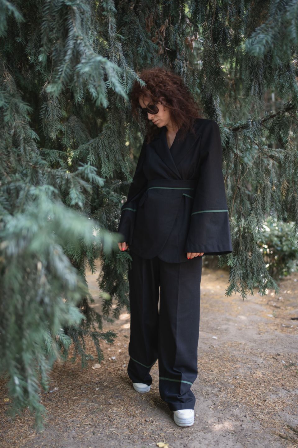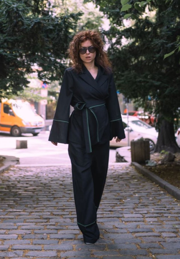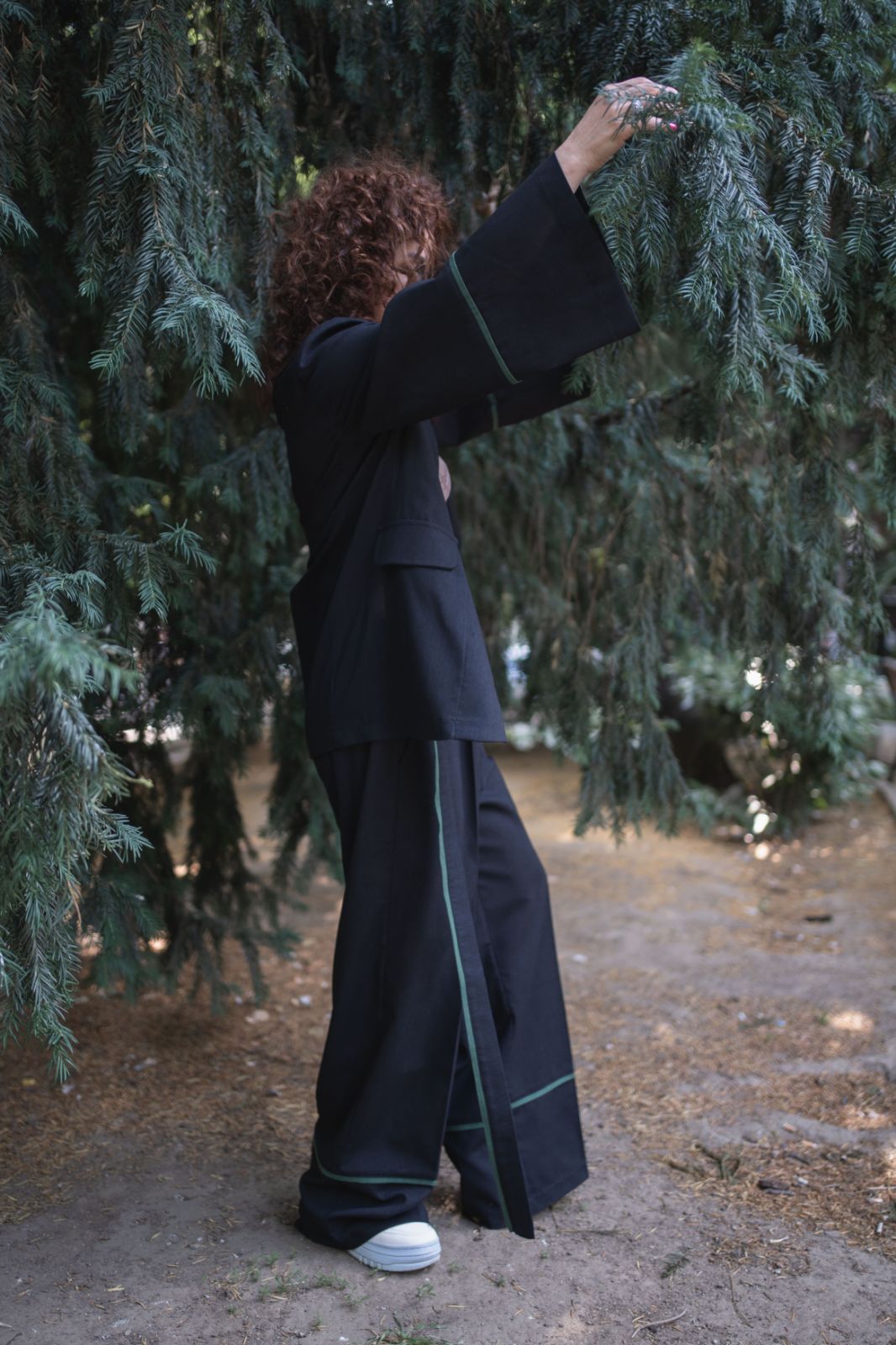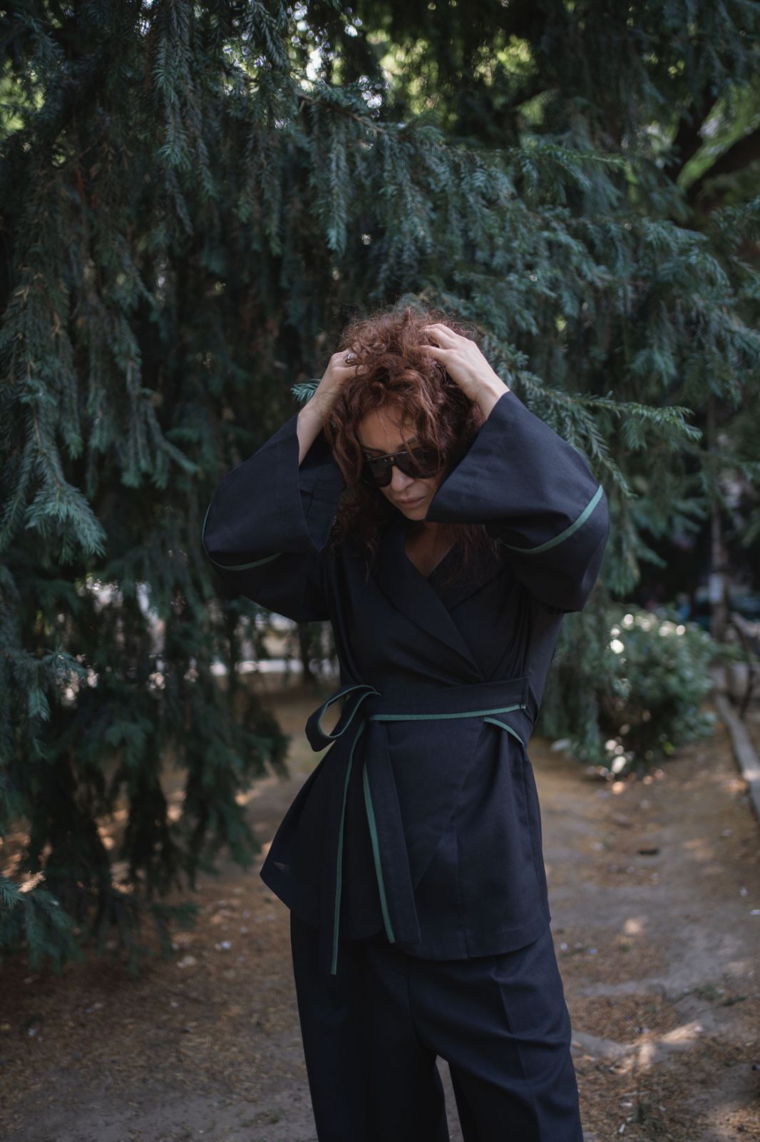 Сакото е овърсайз, с ръкав тип кимоно, който пада меко и създава усещане за обгръщане. Кройката му носи онзи фин жест, който казва: „Прегърни ме, без да ме притежаваш.“