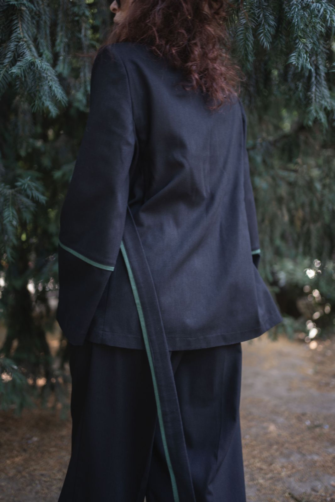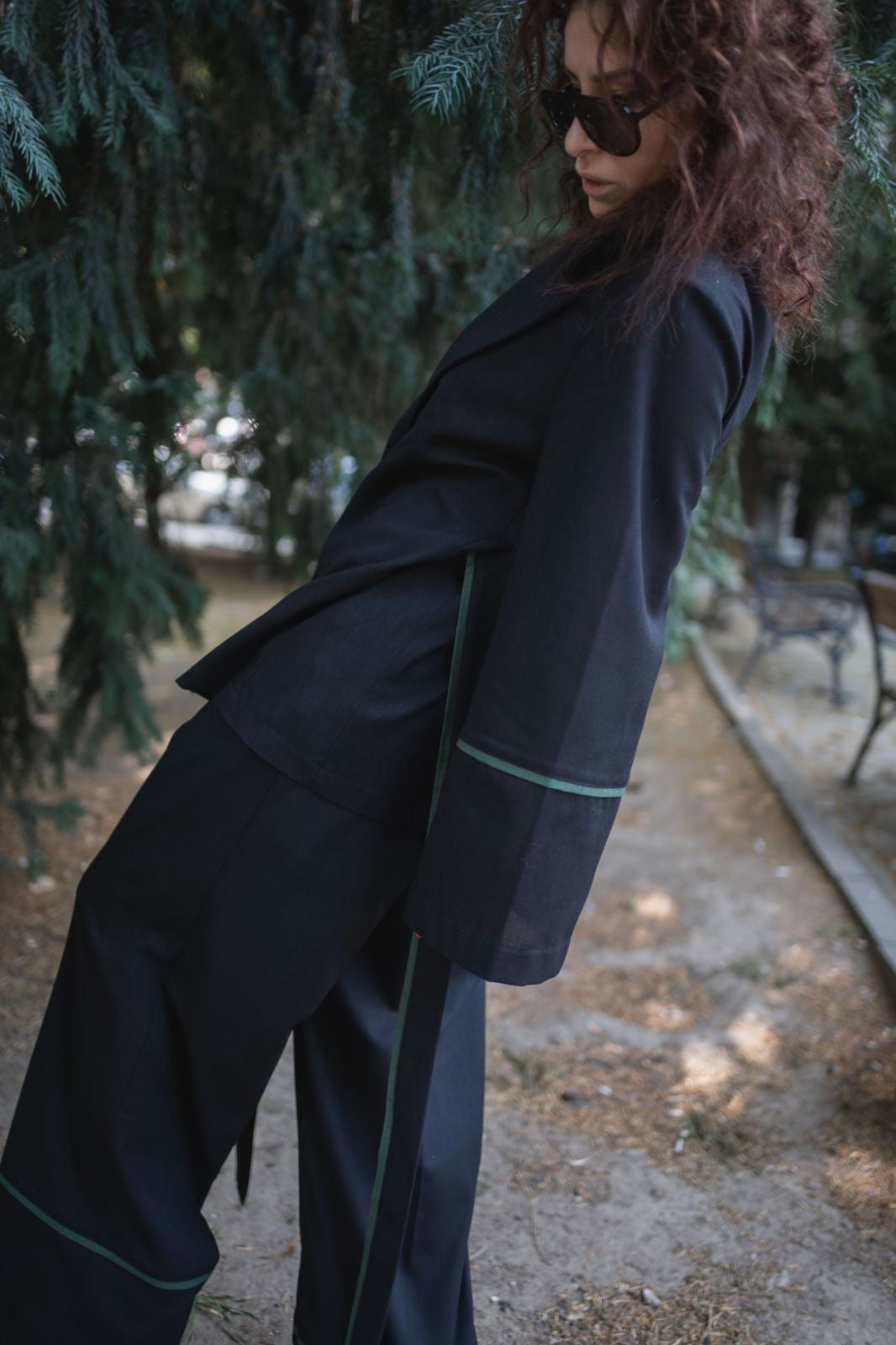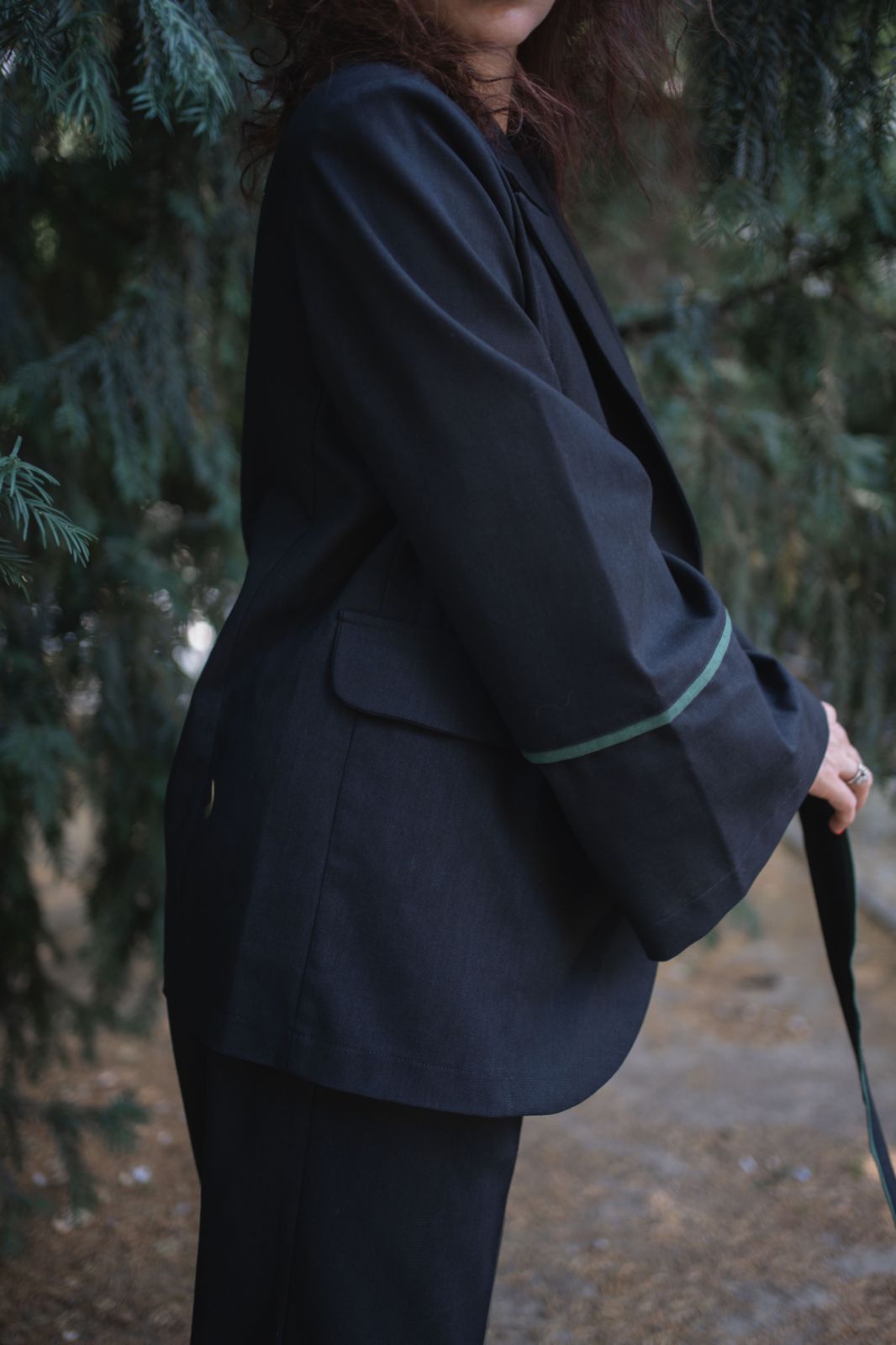 Сакото е овърсайз, с ръкав тип кимоно, който пада меко и създава усещане за обгръщане. Кройката му носи онзи фин жест, който казва: „Прегърни ме, без да ме притежаваш.“