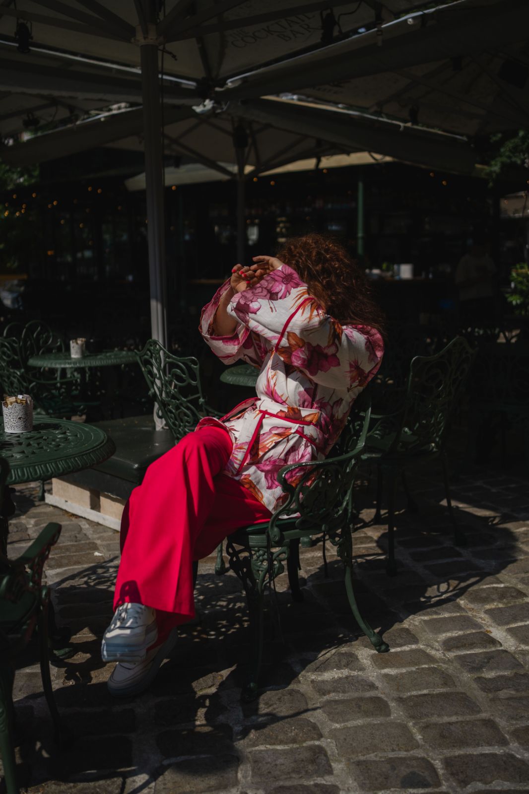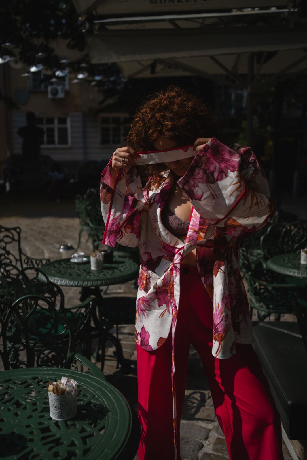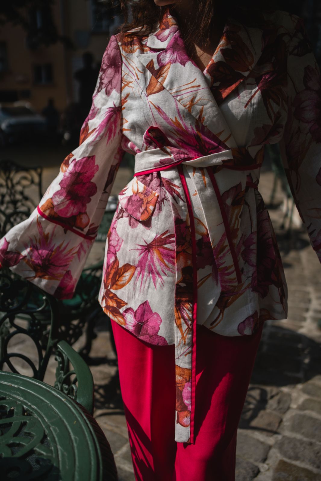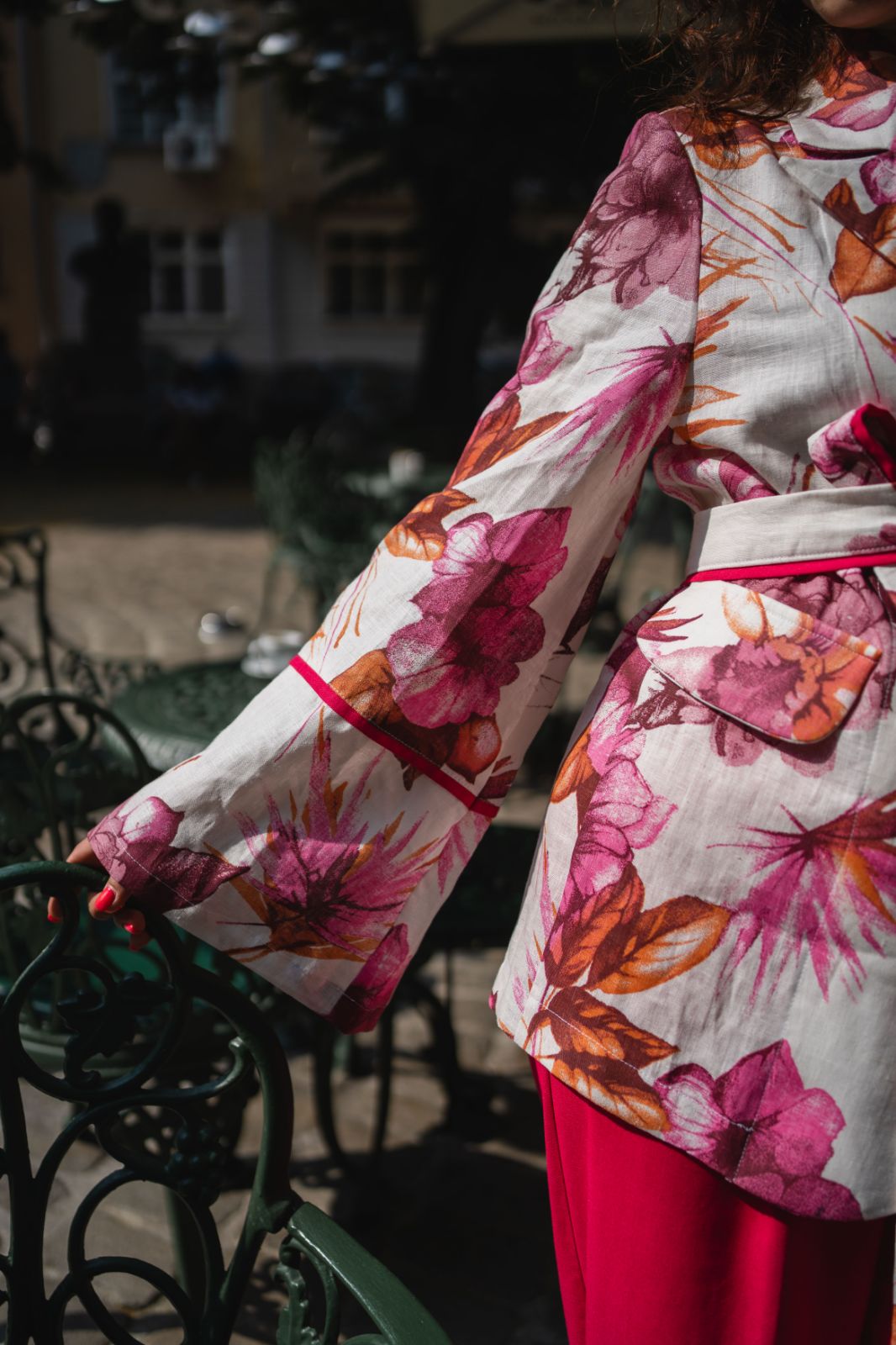 Сакото е овърсайз, с ръкав тип кимоно, който пада меко и създава усещане за обгръщане. Кройката му носи онзи фин жест, който казва: „Прегърни ме, без да ме притежаваш.“