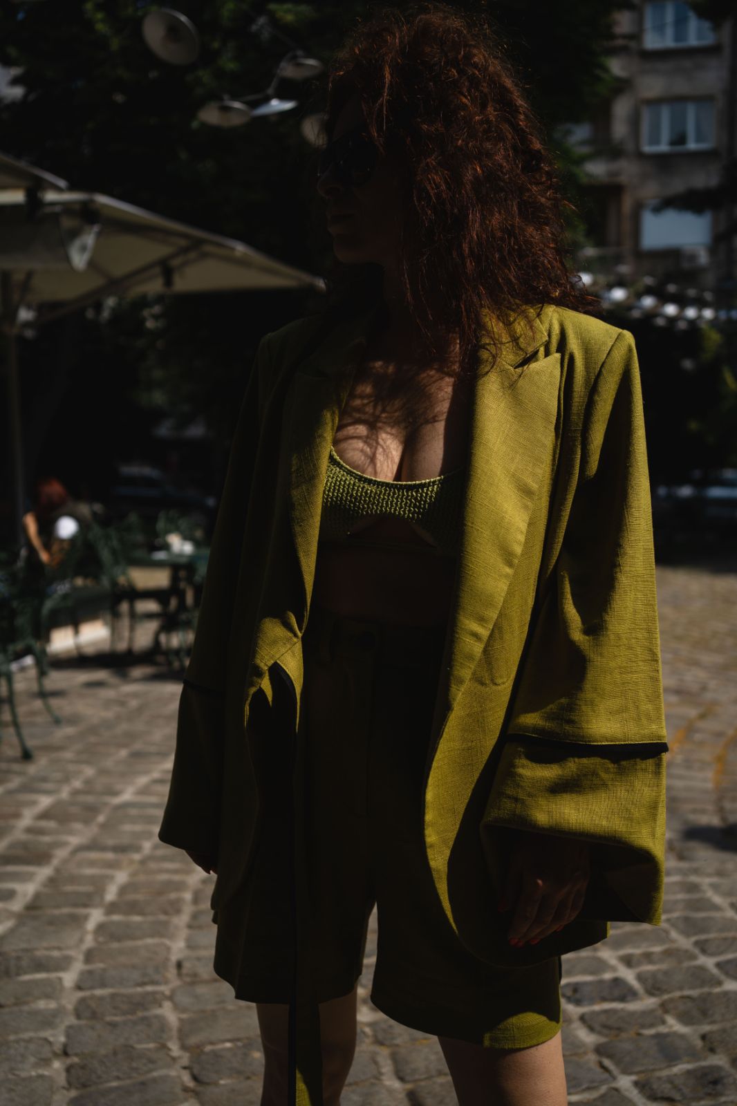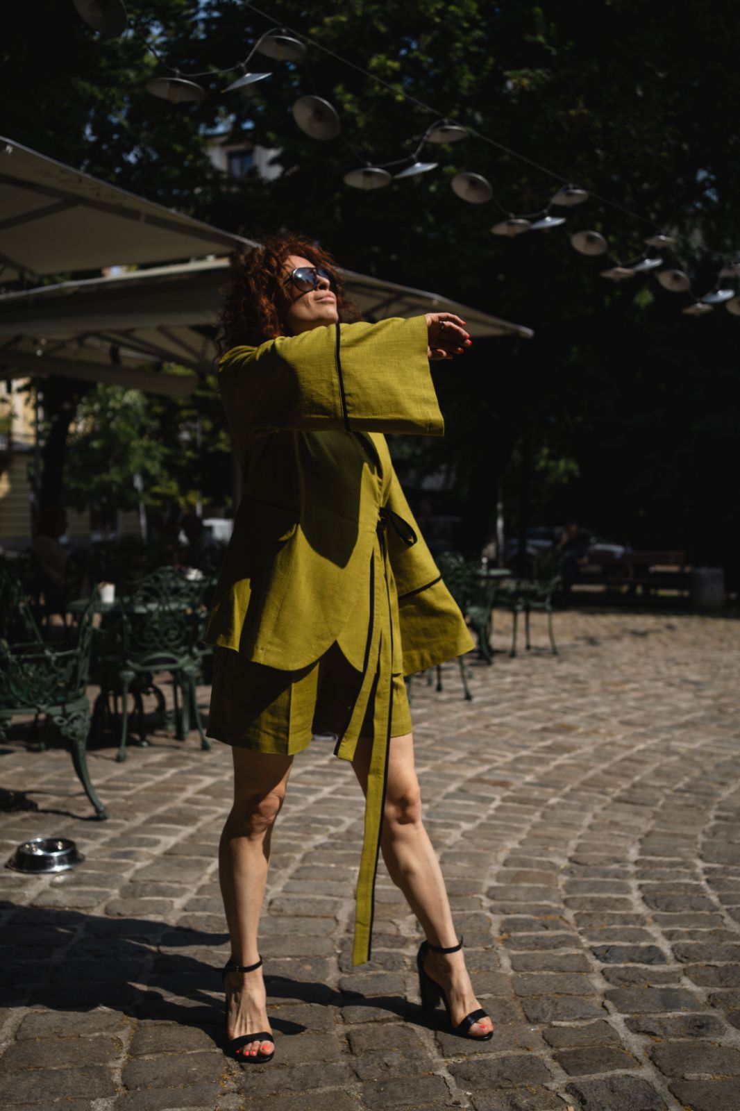 Сакото е овърсайз, с ръкав тип кимоно, който пада меко и създава усещане за обгръщане. Кройката му носи онзи фин жест, който казва: „Прегърни ме, без да ме притежаваш.“