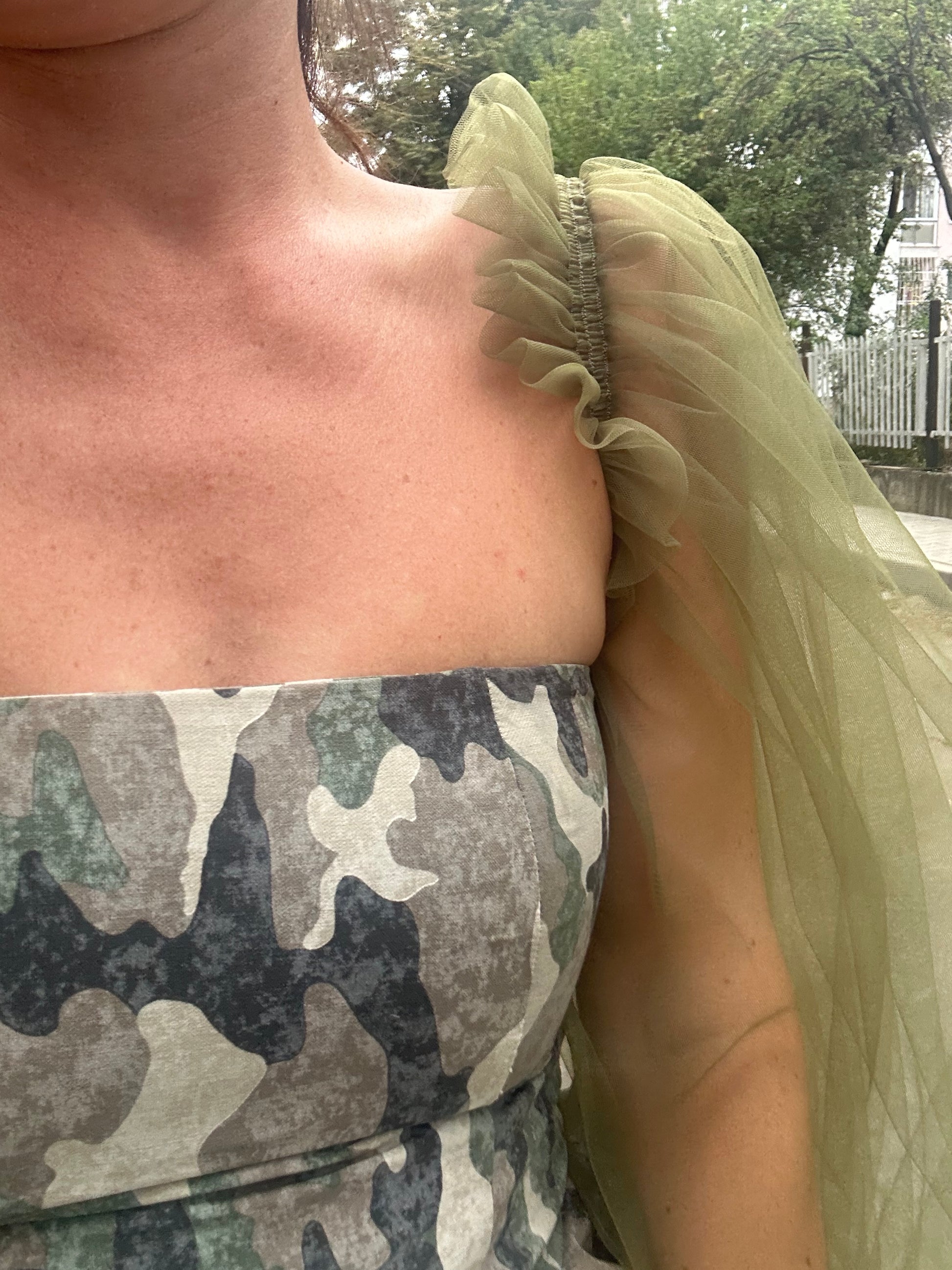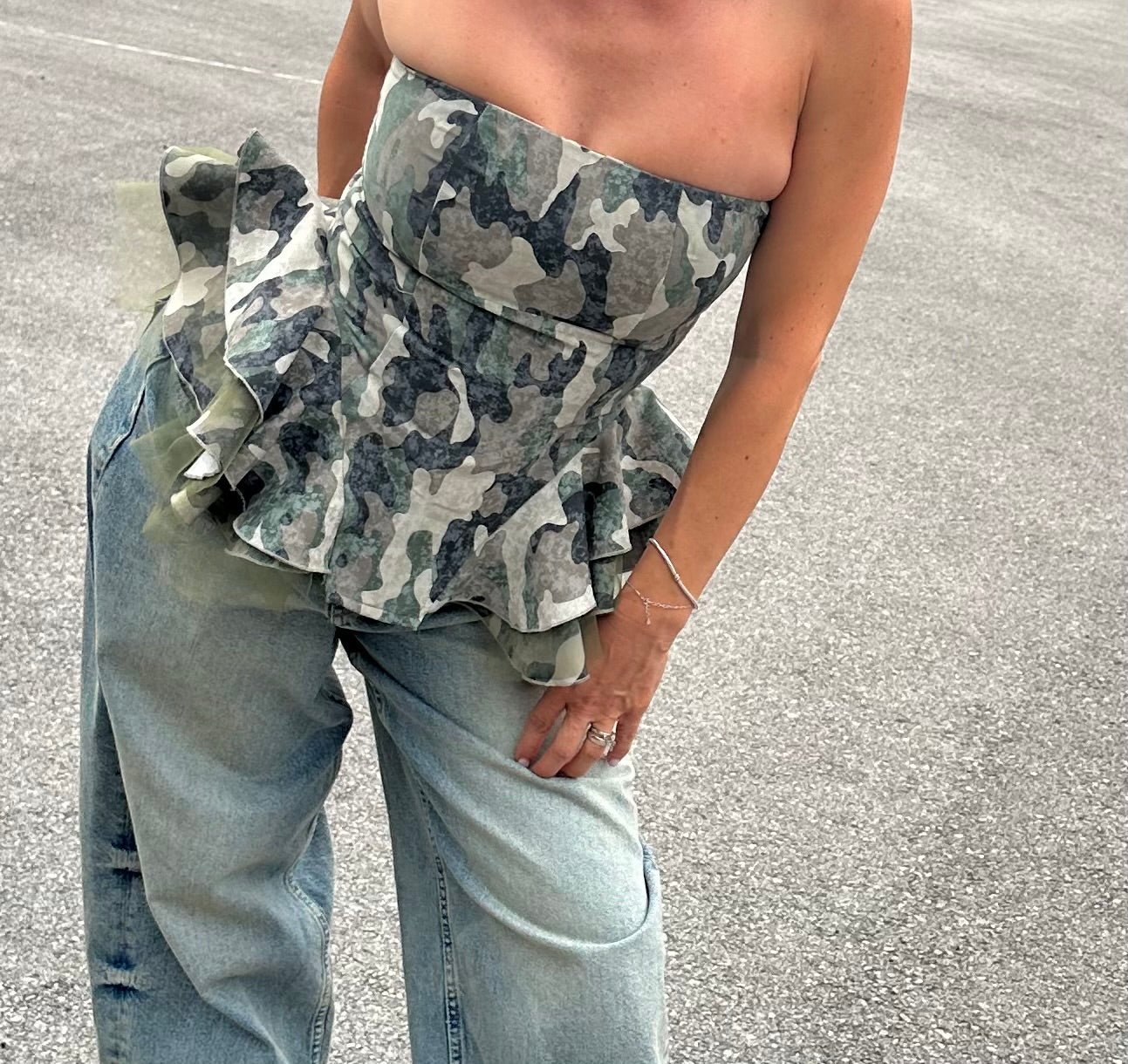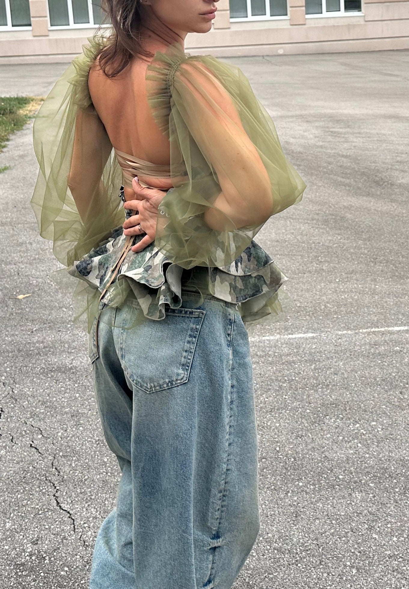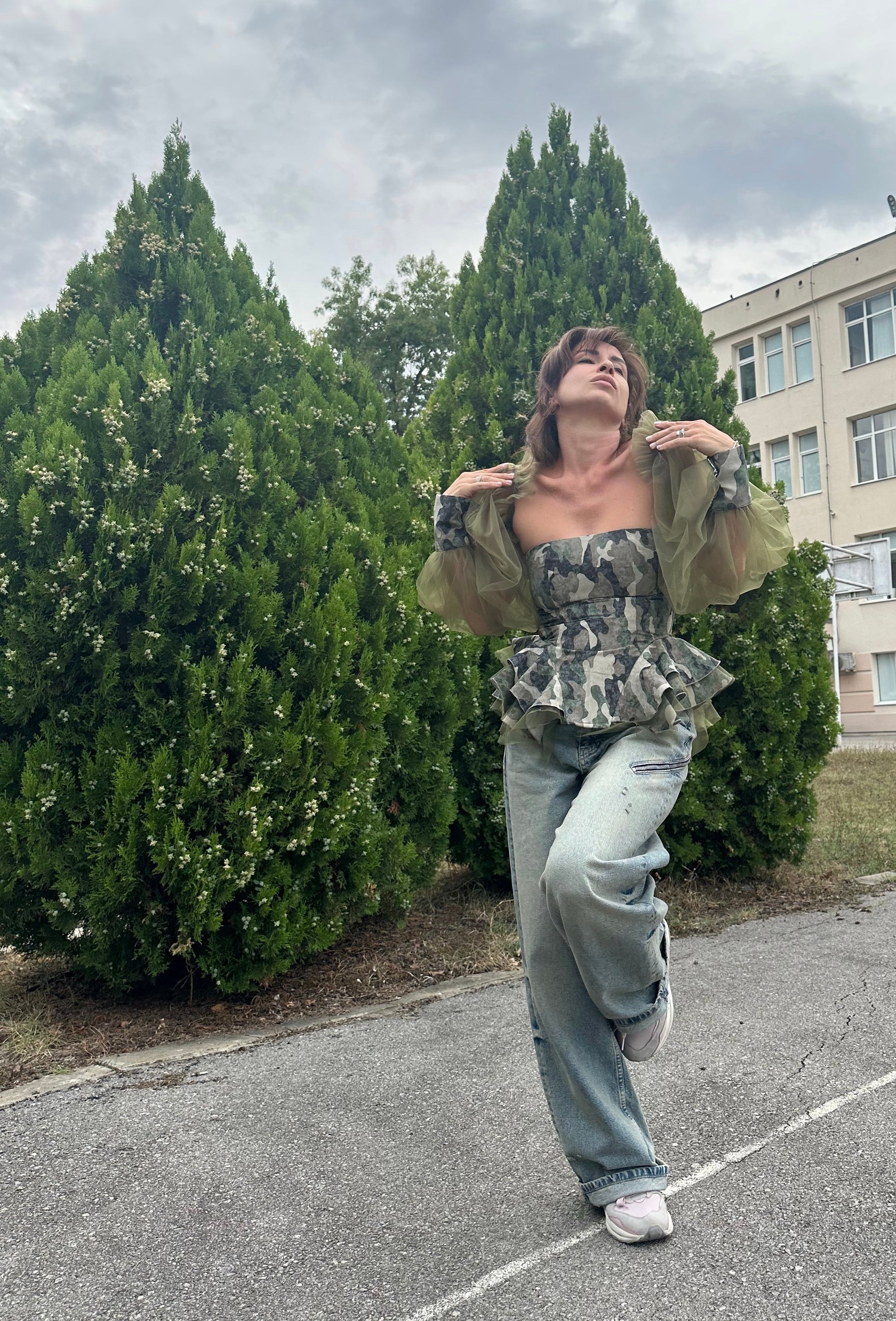 Корсетът е втален и с изрязване в талията, която е обработена с харбали от плата в комбинация от тюл, от който са направени и ръкавите с маншет от основния плат. Женствен и провокативен, можете да съчетаете и в много смели десени с леопардов принт. Денима е предвидим тук