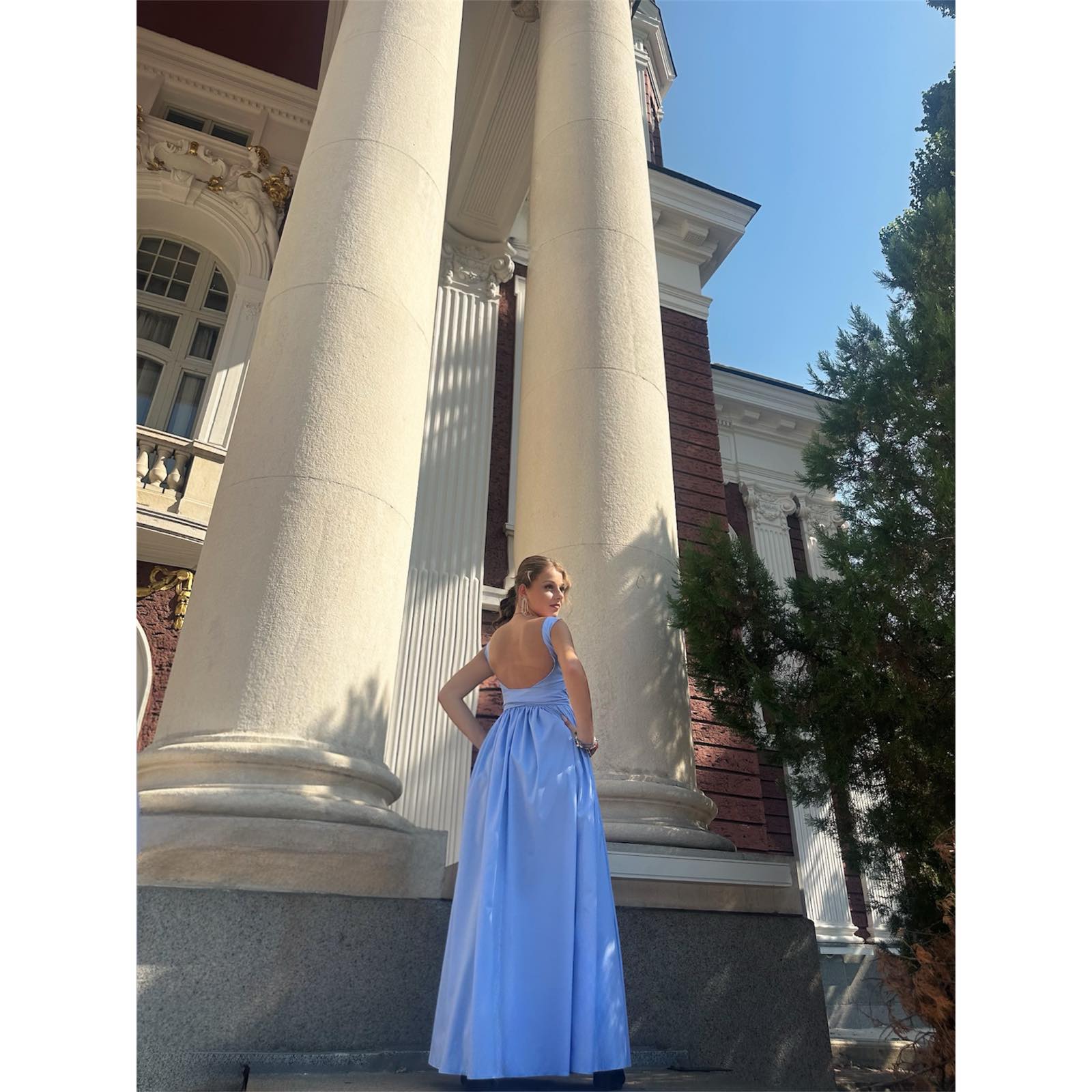 Синята рокля, заснета пред Народния театър „Иван Вазов“, е послание за свобода, достойнство и грация. Архитектурата зад нея подчертава идеята за вечност и култура, а моделът – за женска мекота и увереност.