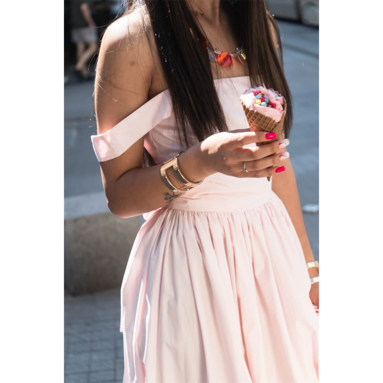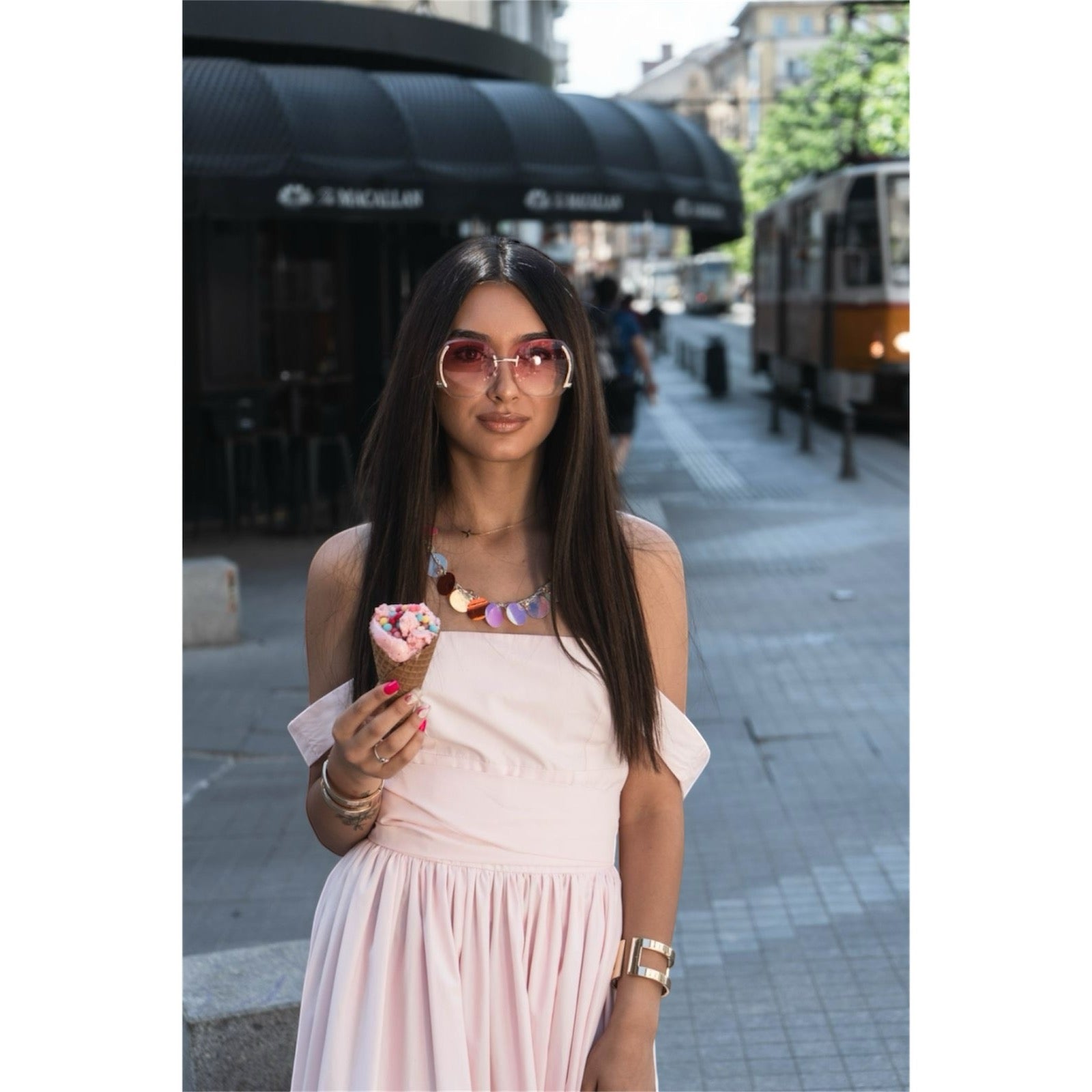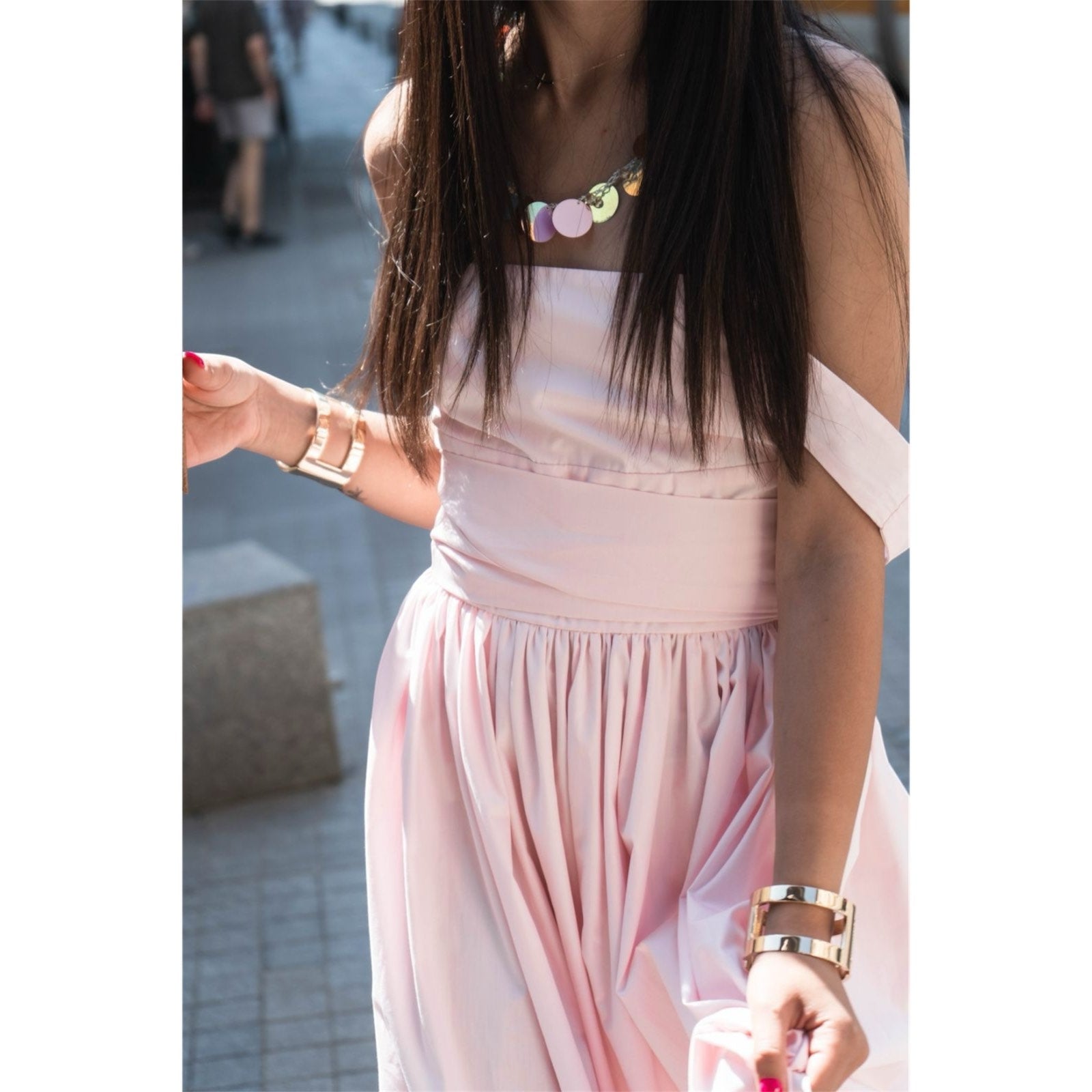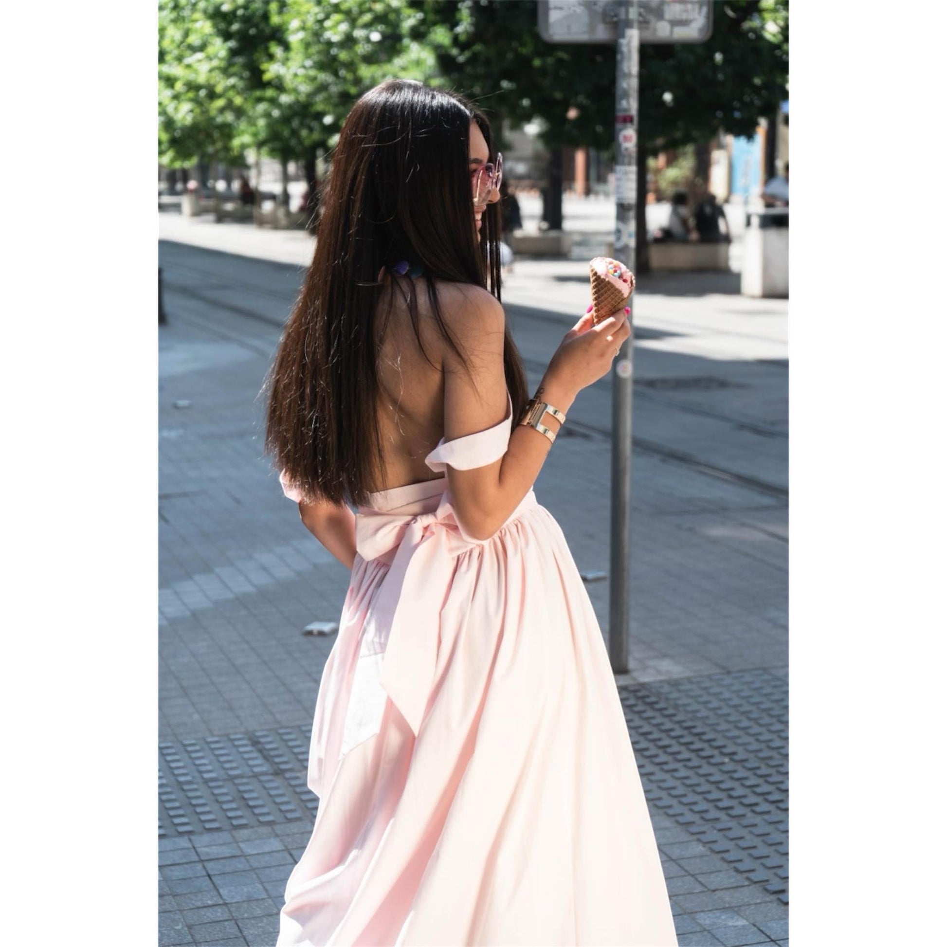 Цветът – пудрено розово – напомня първото усещане за нежност, но го носи жена, която вече добре знае своята сила.