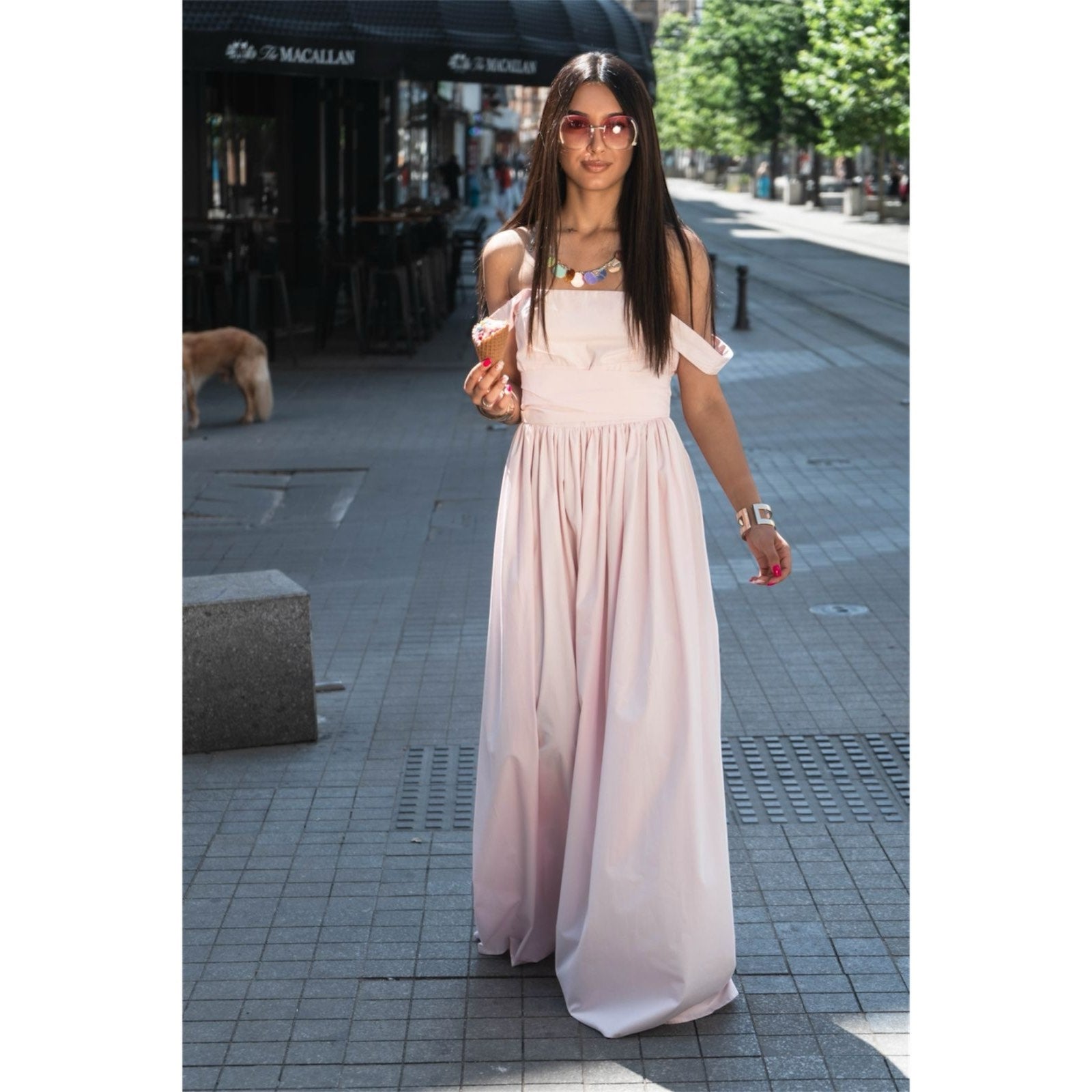 Силуетът е мек, но изваян – подчертана талия, свободна дължина, голи рамене, които говорят повече от думи.