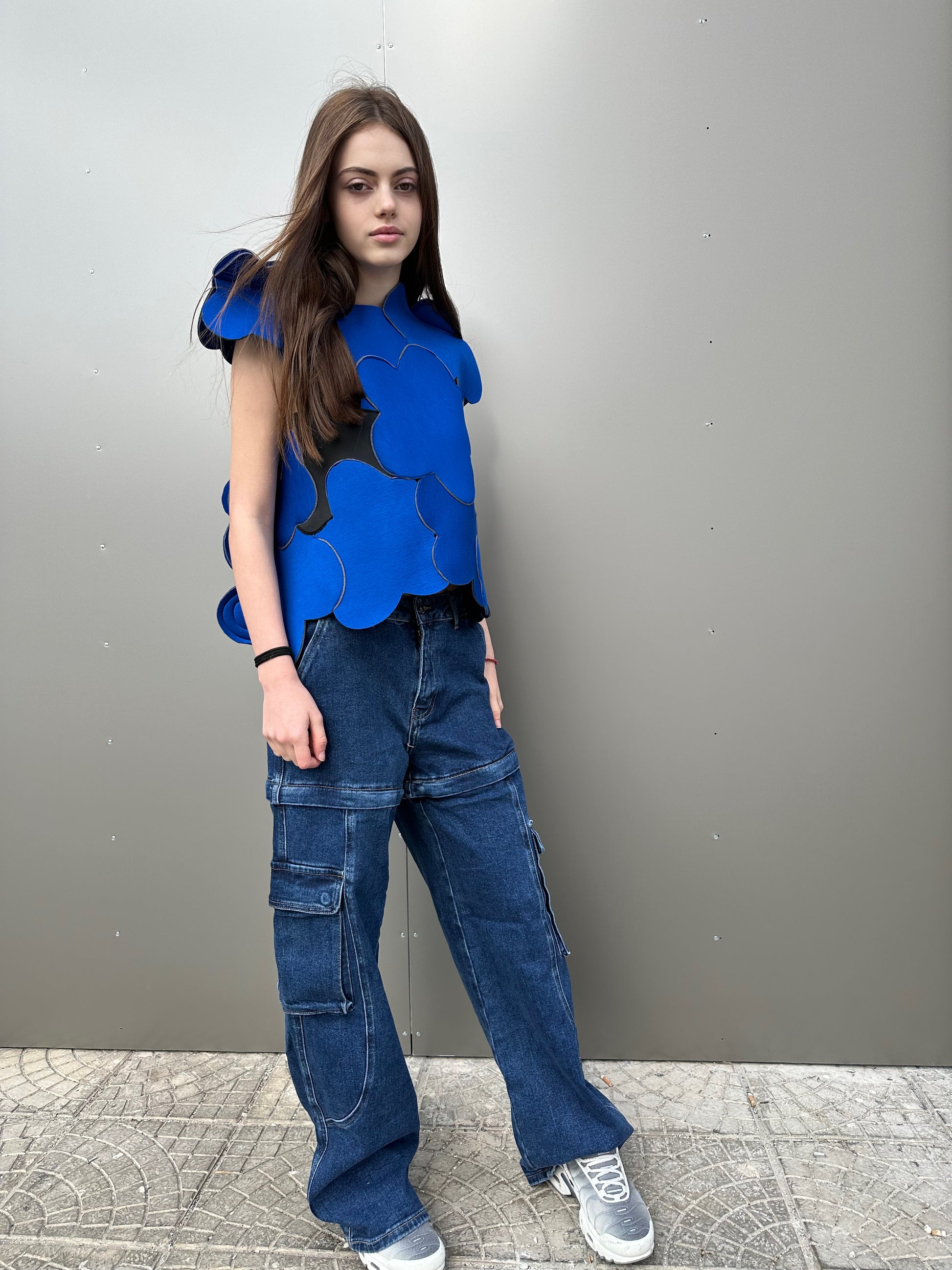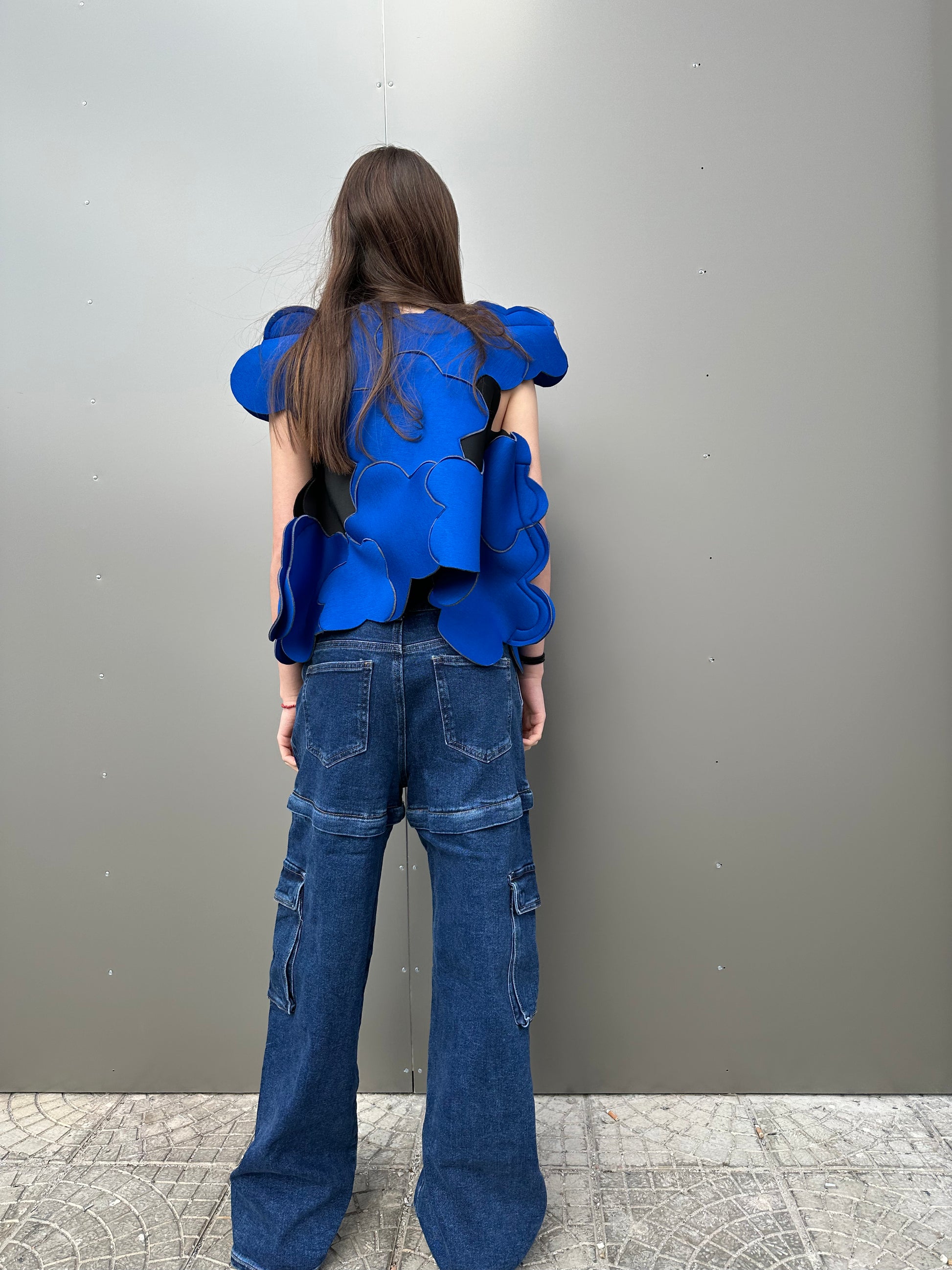 Блузата е направена с ръчно поставени цветя, наредени като пъзел. Материята е лек и тънък памучен неопрен - пластичността му е от значение за модела