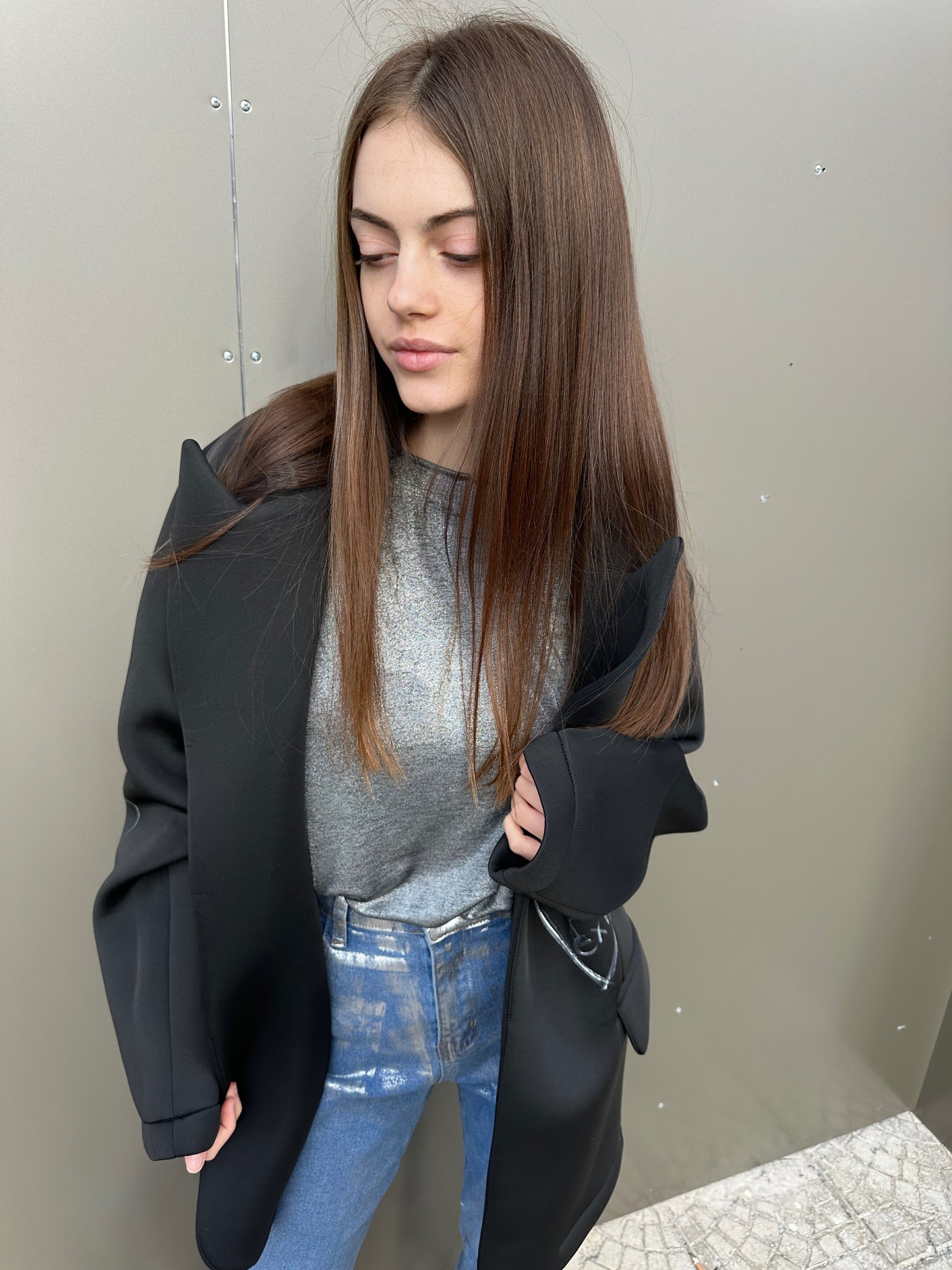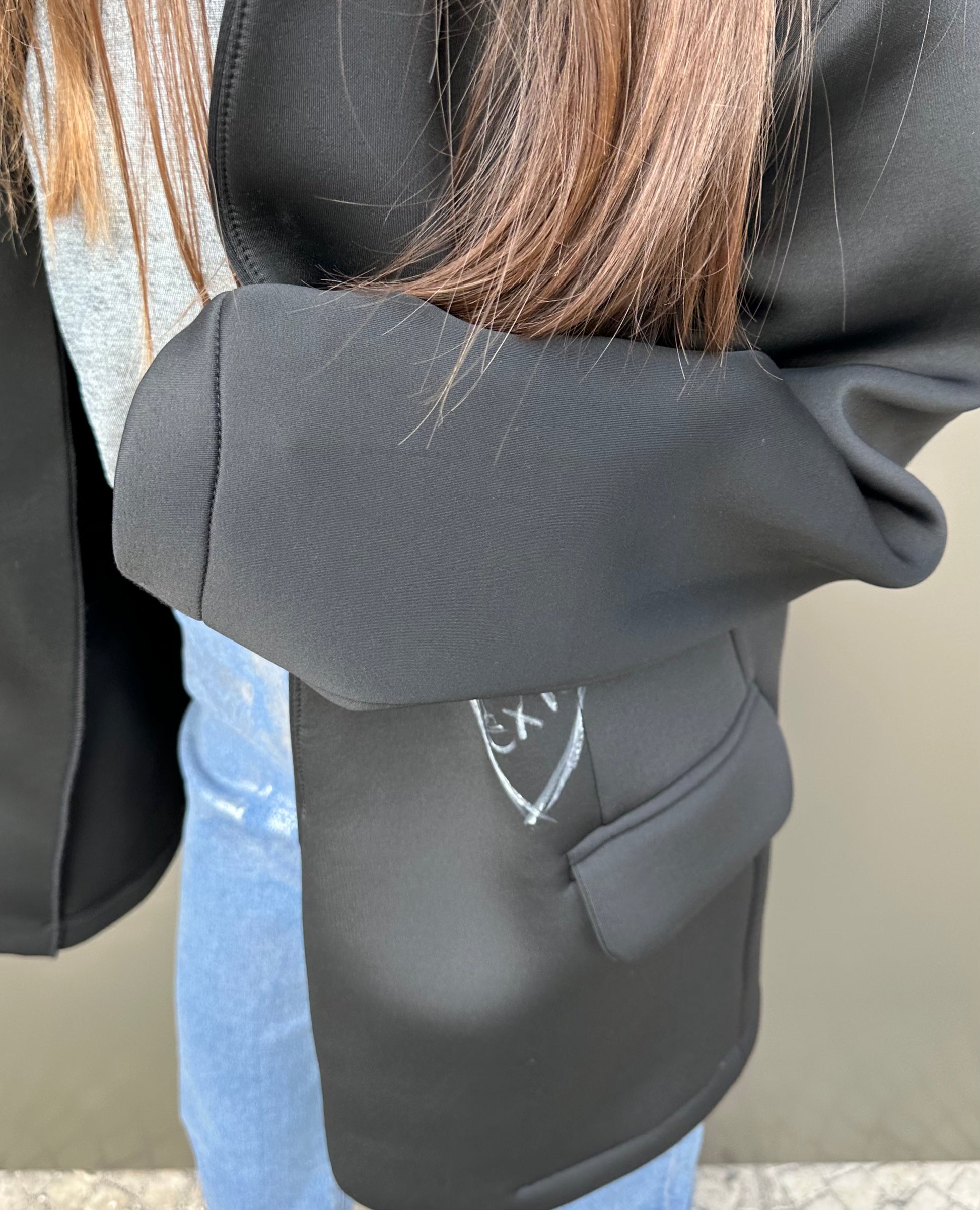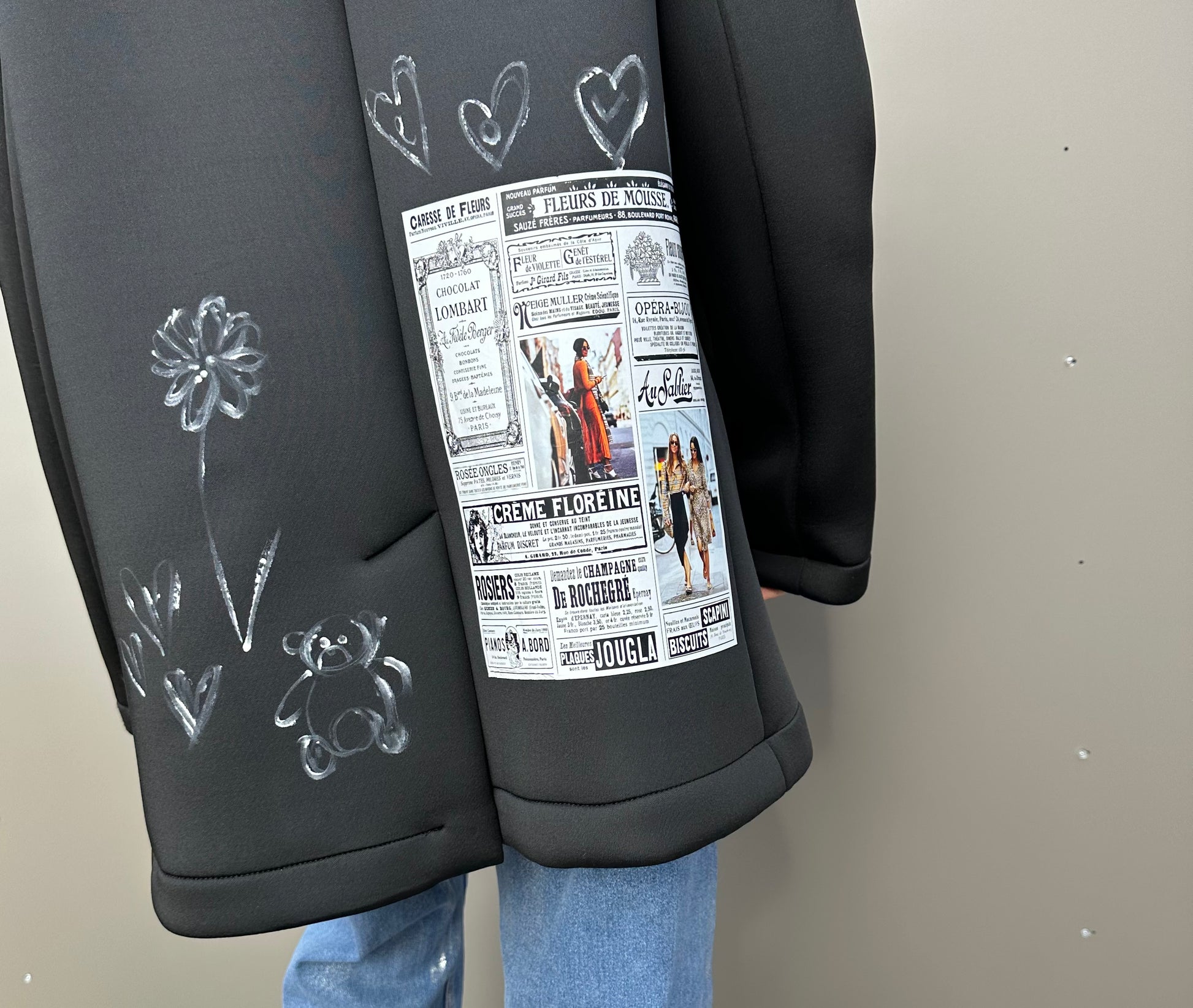 Сакото е от лек неопрен в прав силует - без хастар. В задната част на сакото има щампа