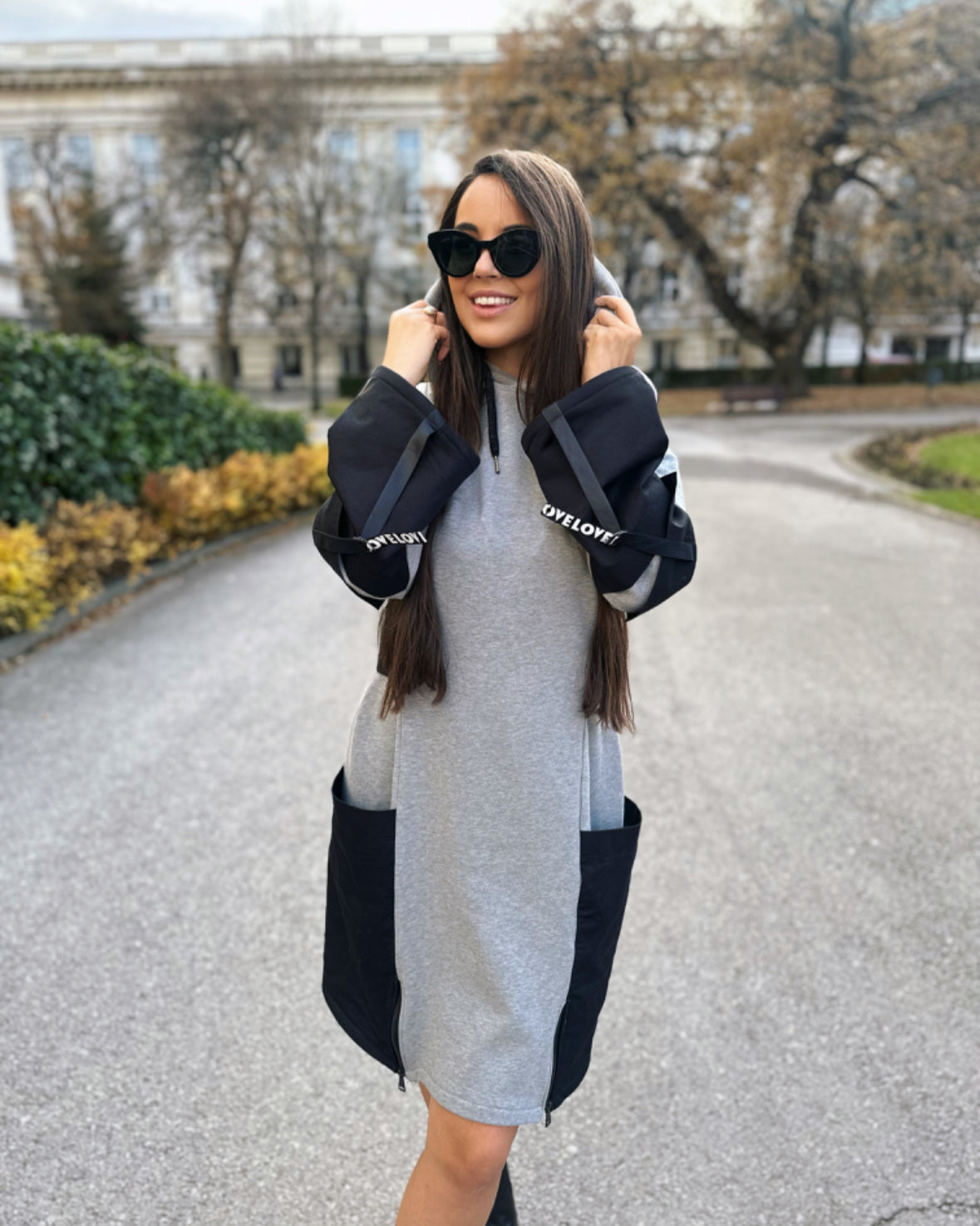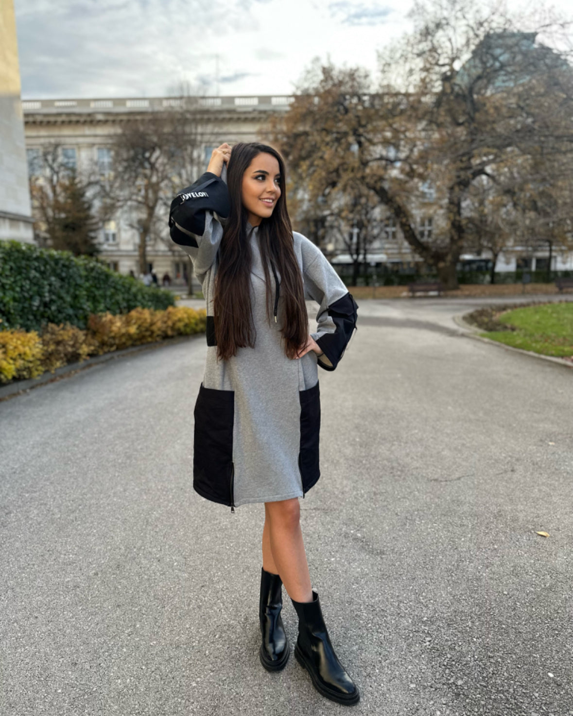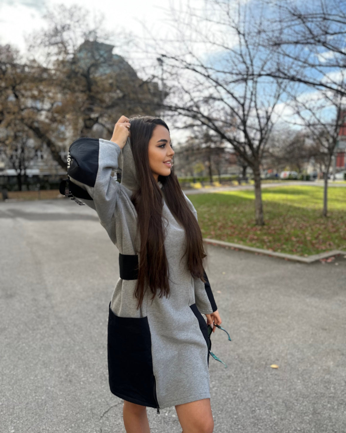 Роклята е от трико с широк ластик на талията, качулка и джобове. Материята е високо качествено трико и памук