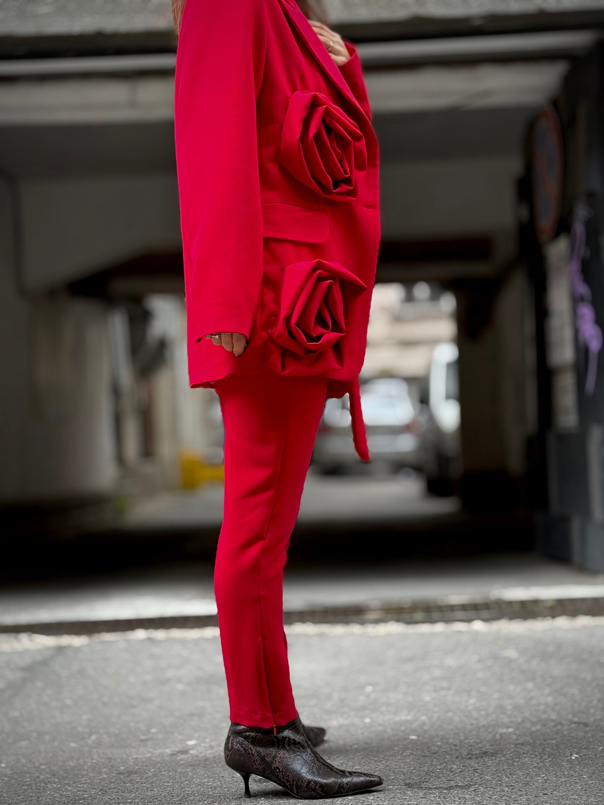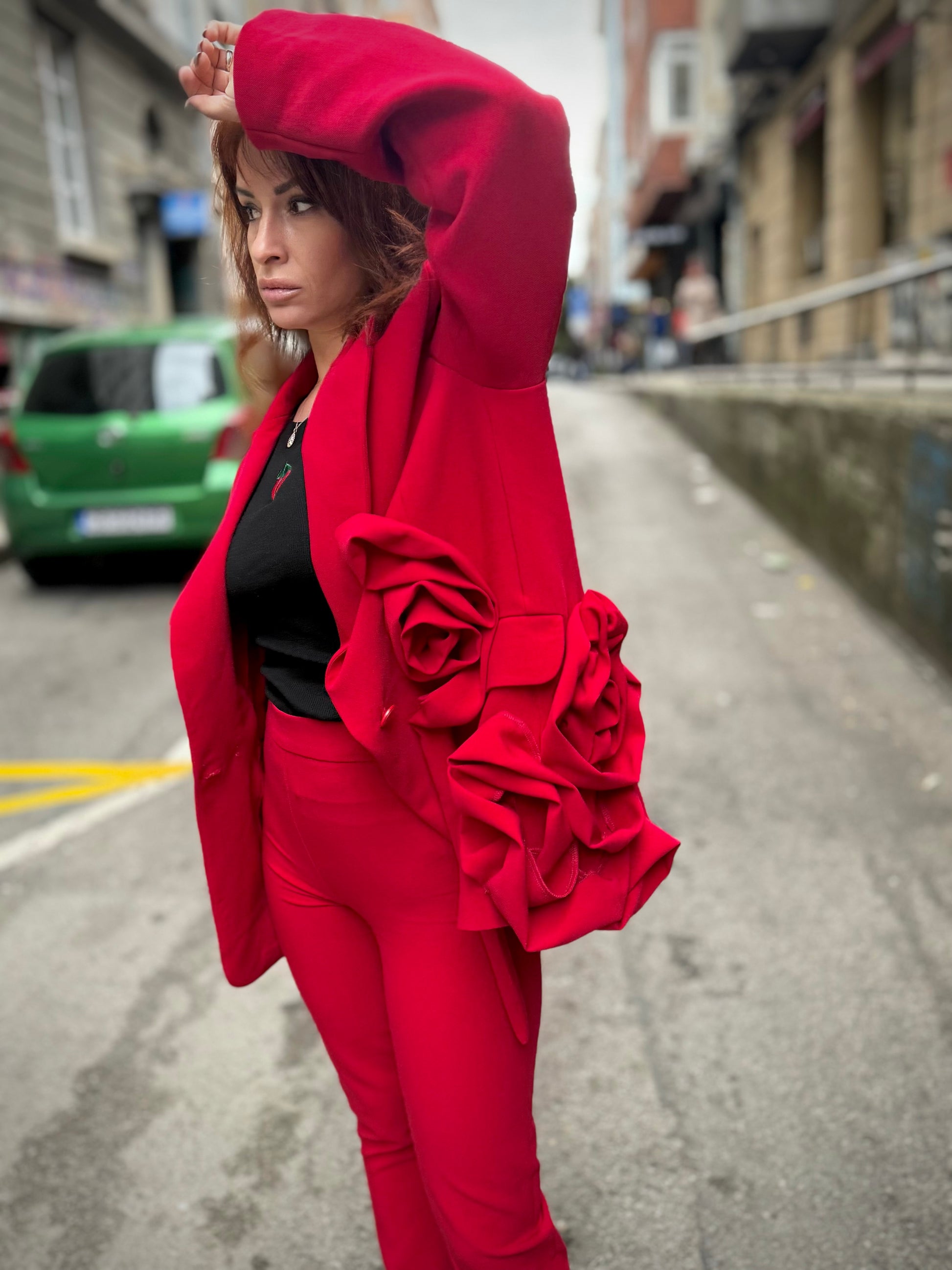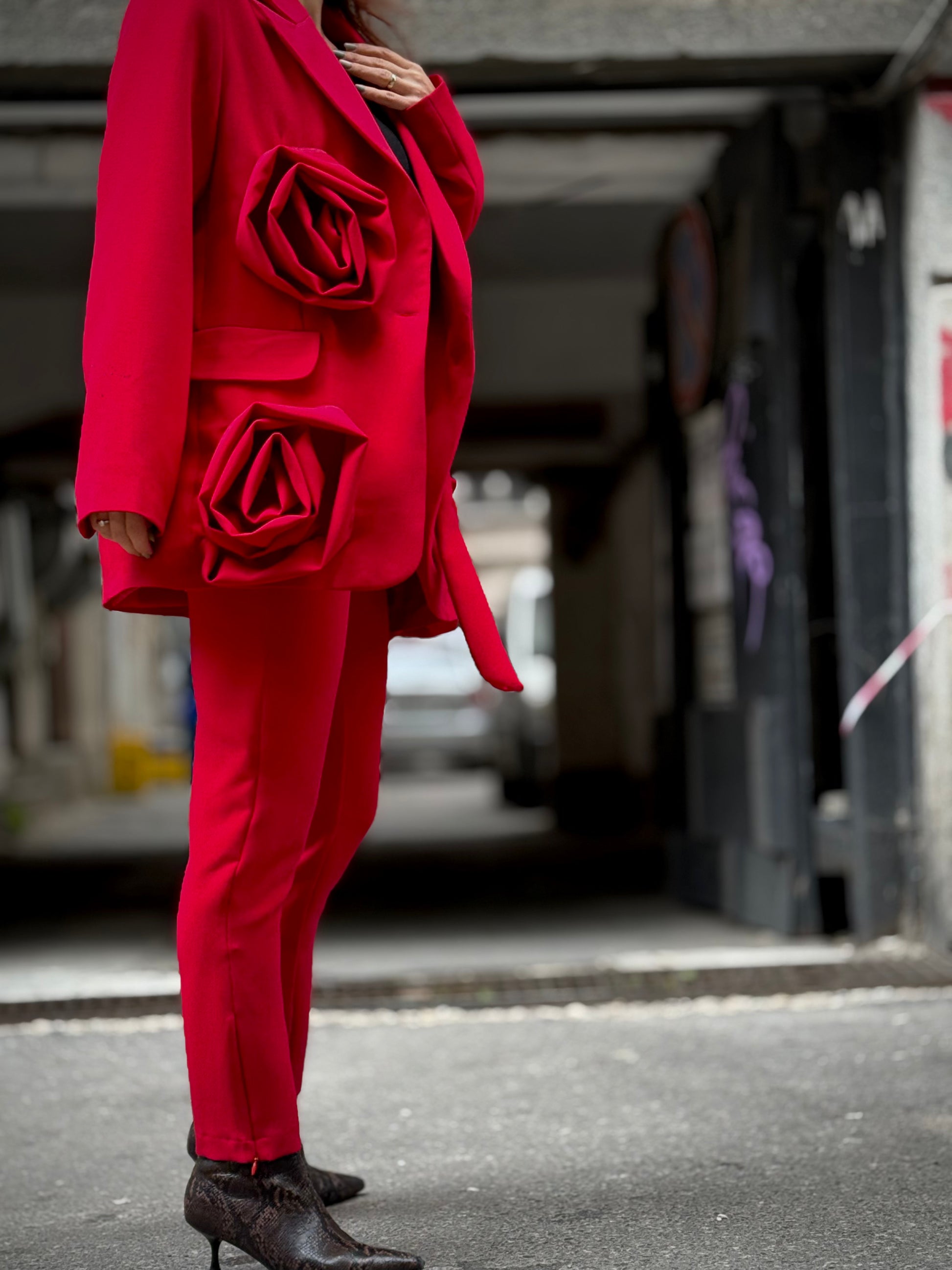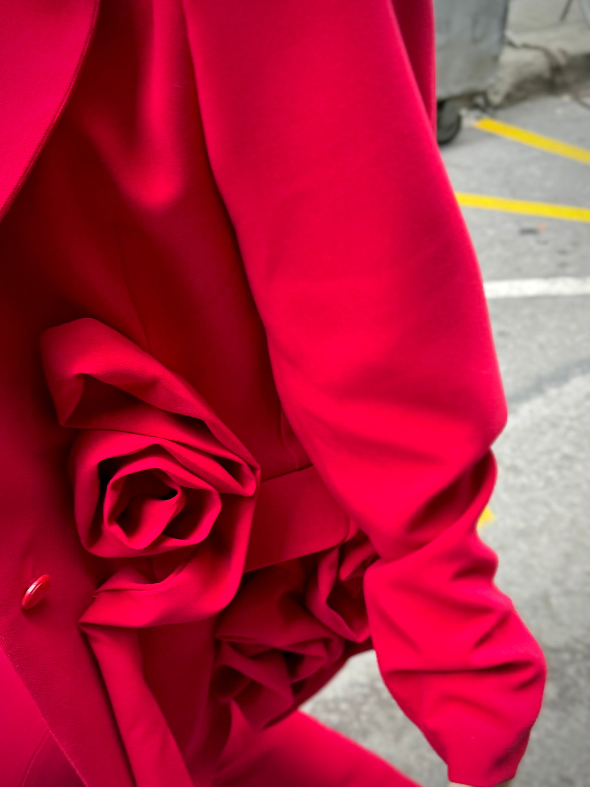 Сакото с ръчна апликация „роза“ пренася контраста между структура и органика: строга линия, която цъфти.