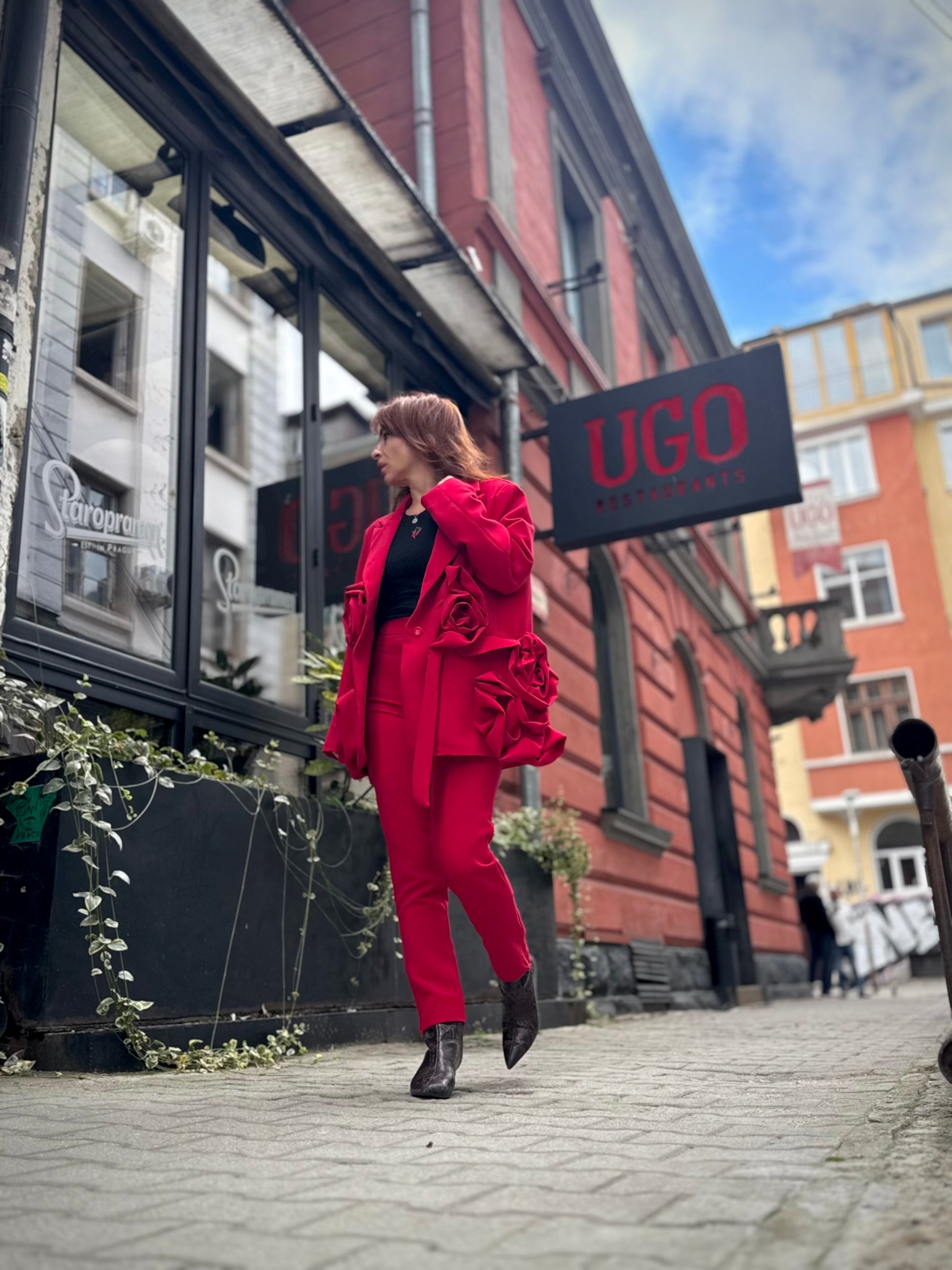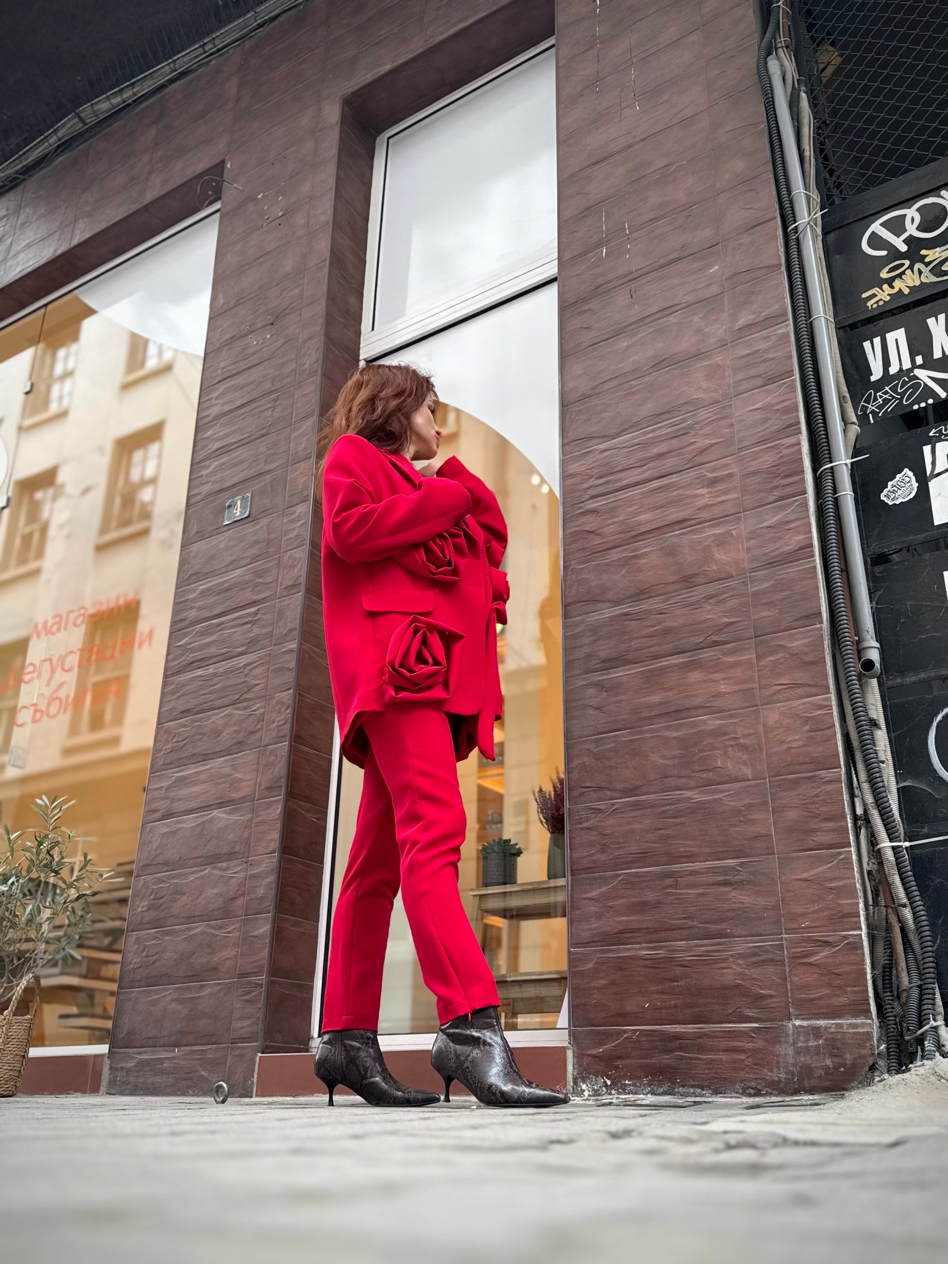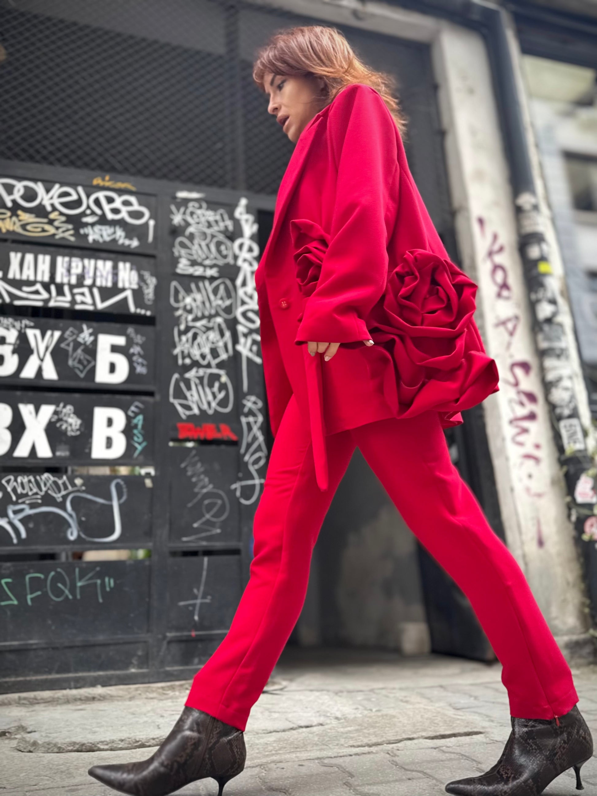 Костюмът „Интегратор“ е архитектура от червено — форма, в която силата и мекотата съжителстват.